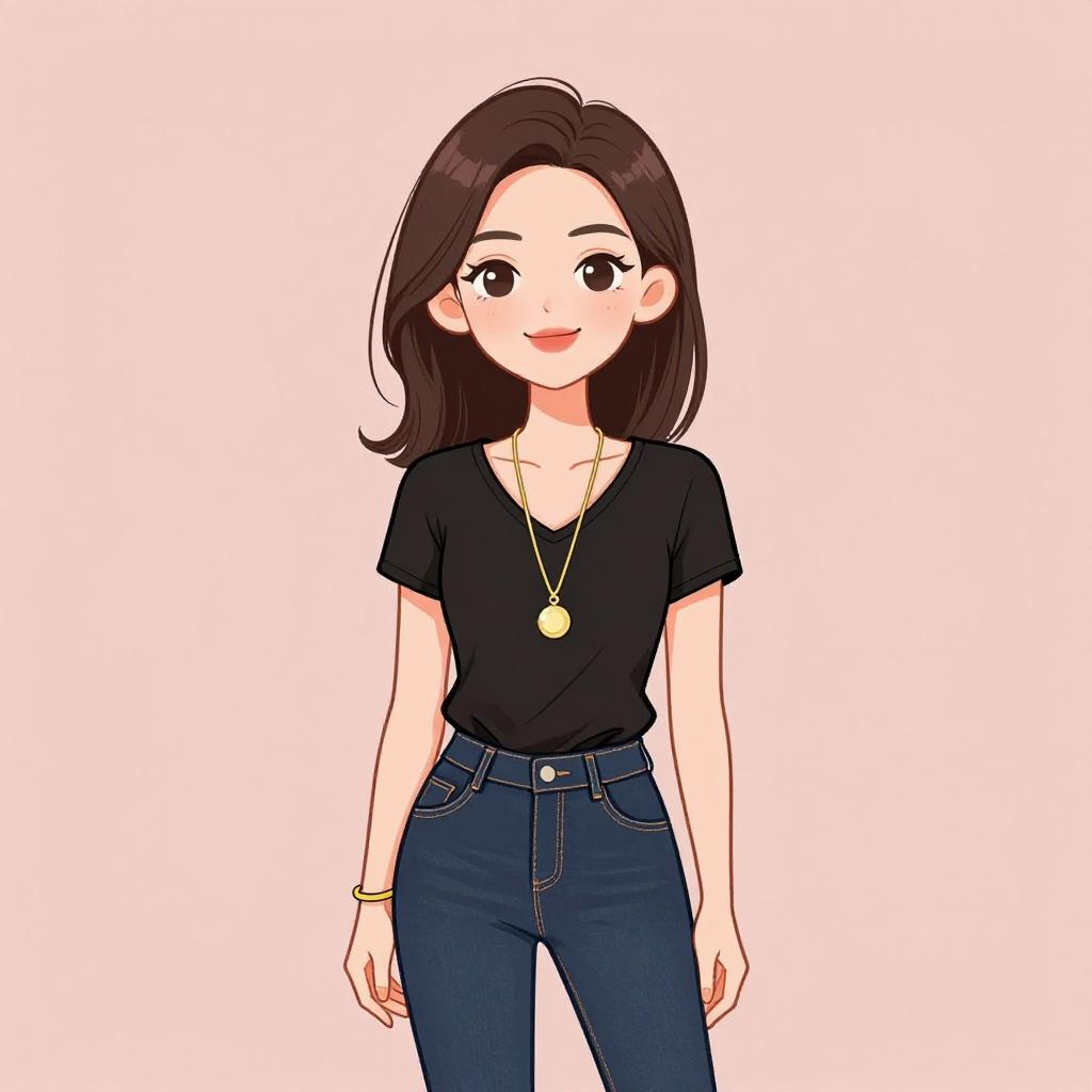 Woman with pretty face and pretty hair. smiling Woman, casual, black long-sleeve pullover with brand logo on elastic hem, crew neckline, fitted denim jeans with light wash, mid-rise waist. --sref 1467