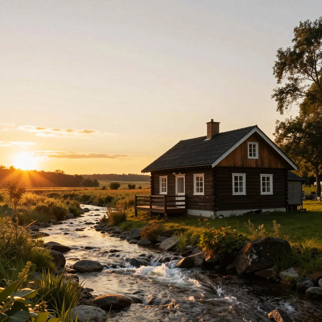 Photograph of a rustic wooden cabin with a dark shingle roof, situated near a flowing stream with rocks and grasses. The cabin has white-framed windows and is bathed in the warm, golden light of a setting sun on the horizon. The sun casts long shadows, highlighting the cabin's textured wood and the surrounding greenery. A tall tree stands to the right, while the stream runs through the foreground, glistening with sunlight reflections. The sky is clear with a gradient from orange to yellow. The scene evokes a peaceful, countryside setting.