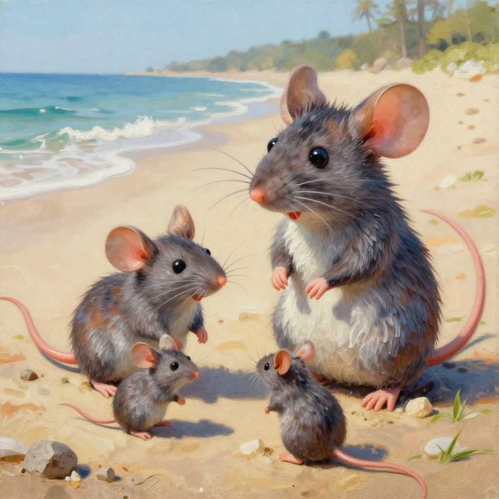 This vibrant, digitally painted image depicts four grey and white mice with pink ears and tails on a sunny, sandy beach with clear blue ocean waves in the background. The largest mouse stands upright on its hind legs, looking attentively to the left, while three smaller mice, one standing and two sitting, gather around it. The sand is dotted with small rocks and tufts of grass. The painting style is realistic with bright, vivid colors and fine details, capturing the textures of the mice's fur and the beach environment. The background includes a blurred line of green trees along the horizon.