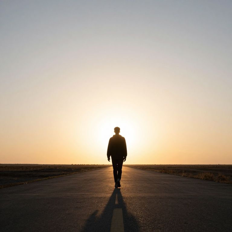 A solitary figure walks toward the horizon, their silhouette etched against the radiant sun, embodying the quiet introspection of a soul navigating the vast expanse of memory and possibility, where each step echoes with the weight of the past and the promise of the unknown future.
