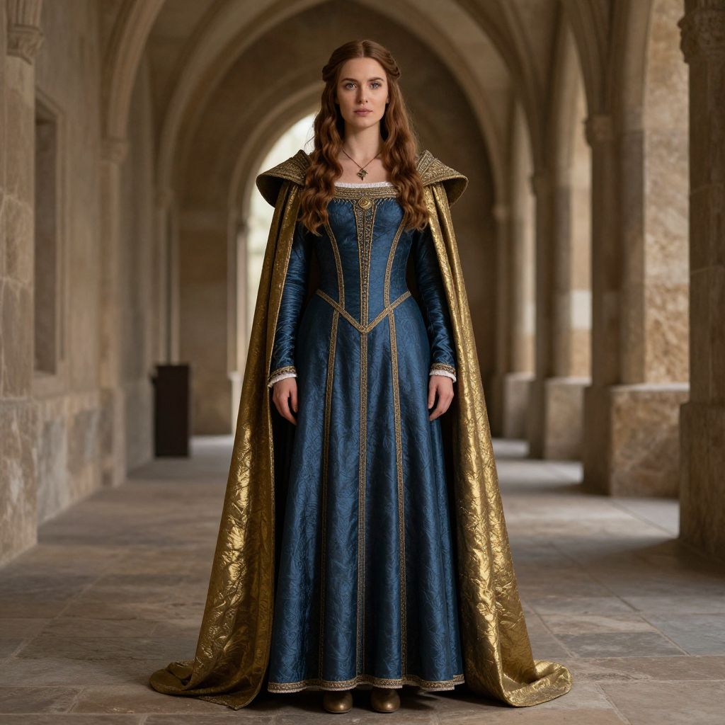 Photograph of a young woman with long, wavy brown hair, standing in a medieval stone corridor with arched ceilings. She wears a rich blue, medieval-style gown with gold trim and intricate patterns, and a long, ornate gold cape that drapes over her shoulders. Her expression is serious, and she gazes directly at the camera. The background features aged, beige stone walls and a narrow, tiled floor. The lighting is soft, casting subtle shadows that enhance the historical ambiance. The image exudes a regal, historical fantasy vibe.