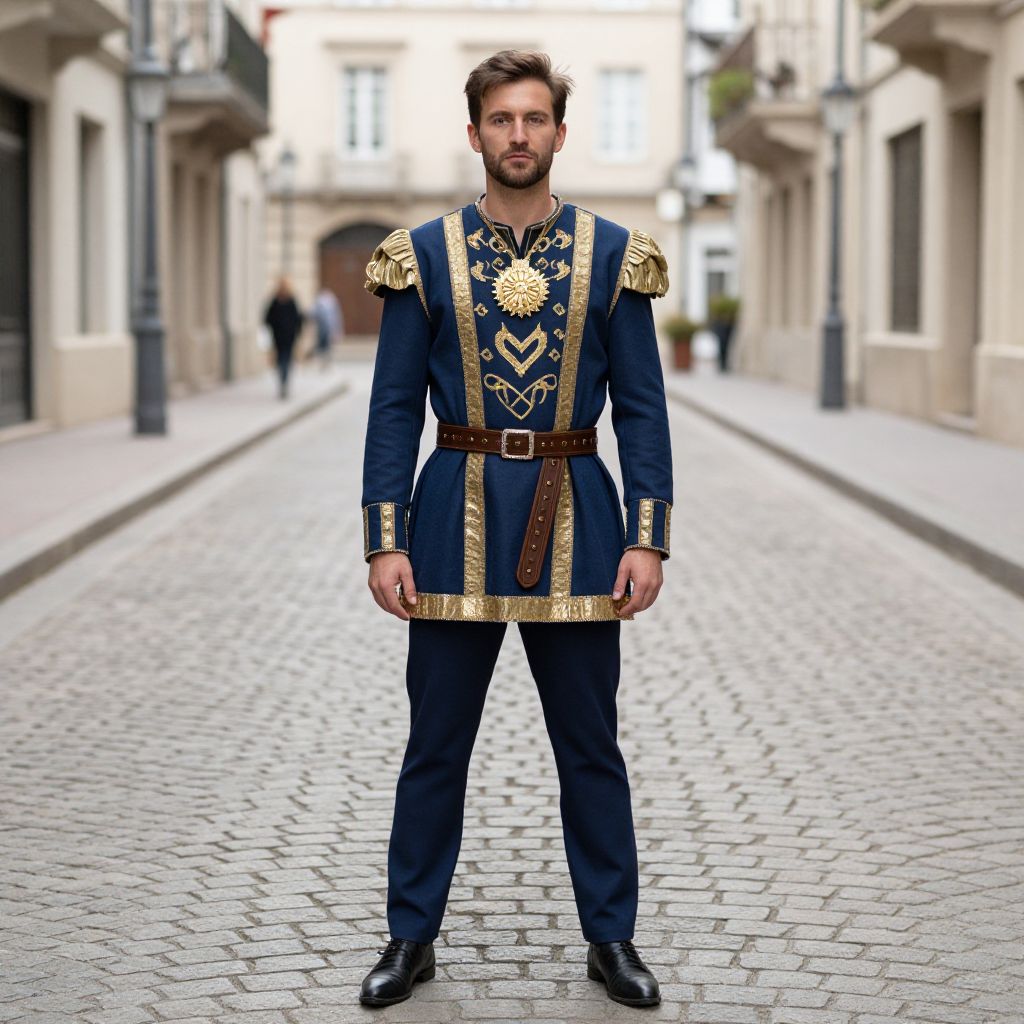 Musketeer Fancy Dress, man in a blue and gold costume standing in a cobblestone street