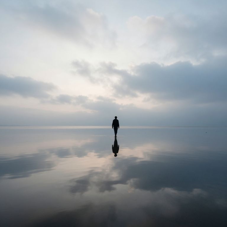 Photograph of a solitary figure standing on a reflective, glass-like surface at dawn or dusk. The person, silhouetted in dark clothing, is centered, with a sharp reflection beneath them. The sky above is overcast with thick, gray clouds, allowing a soft, diffused light to permeate the scene. The horizon is barely visible, blending into the calm, mirrored water. The color palette is predominantly cool blues and grays, creating a tranquil, almost ethereal atmosphere. The figure's stance is upright, and their shadow is clearly defined in the reflective surface.