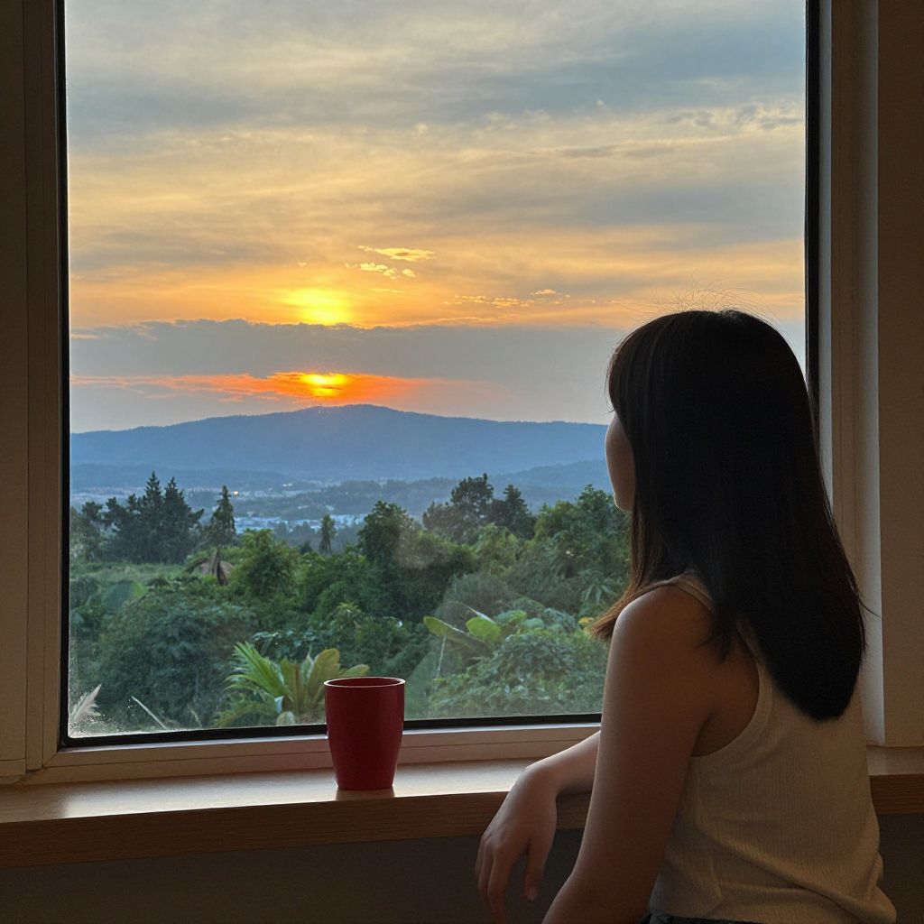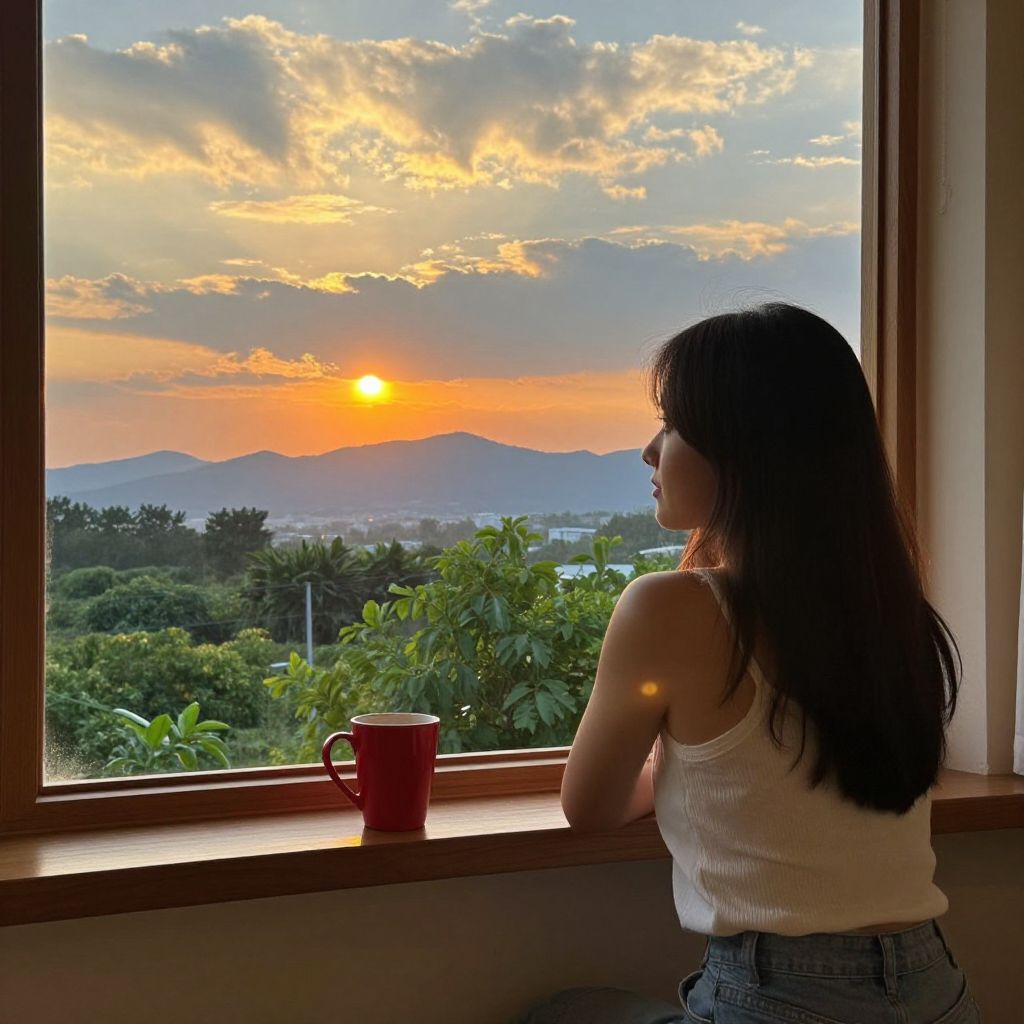 Young woman seated by a vibrant window, gazing out at a serene sunset scene featuring a golden sun, layered clouds, distant mountains, and lush greenery, while a red cup rests on the windowsill beside her.
