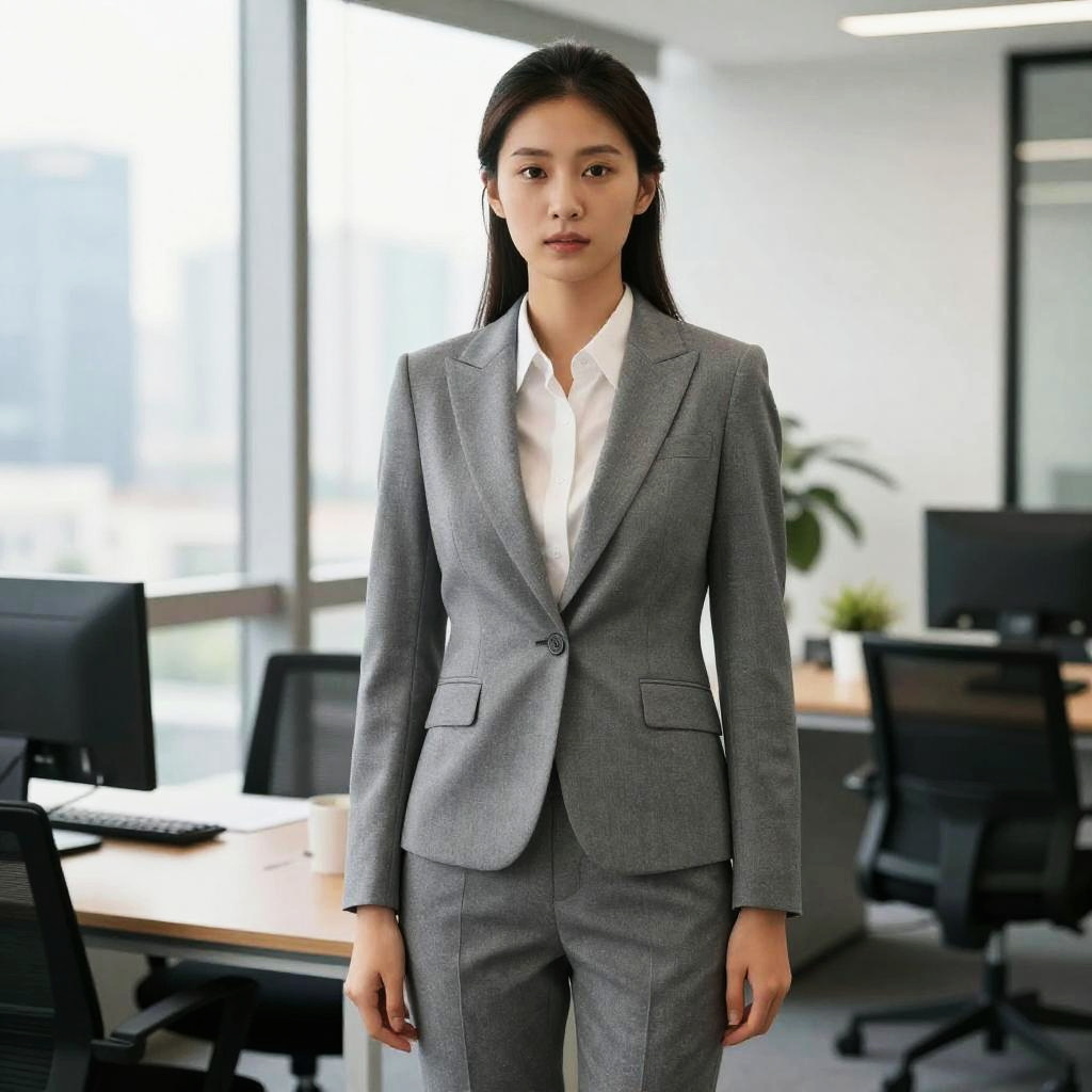 Executive Wear Ladies, woman in a gray suit standing in an office with a city view