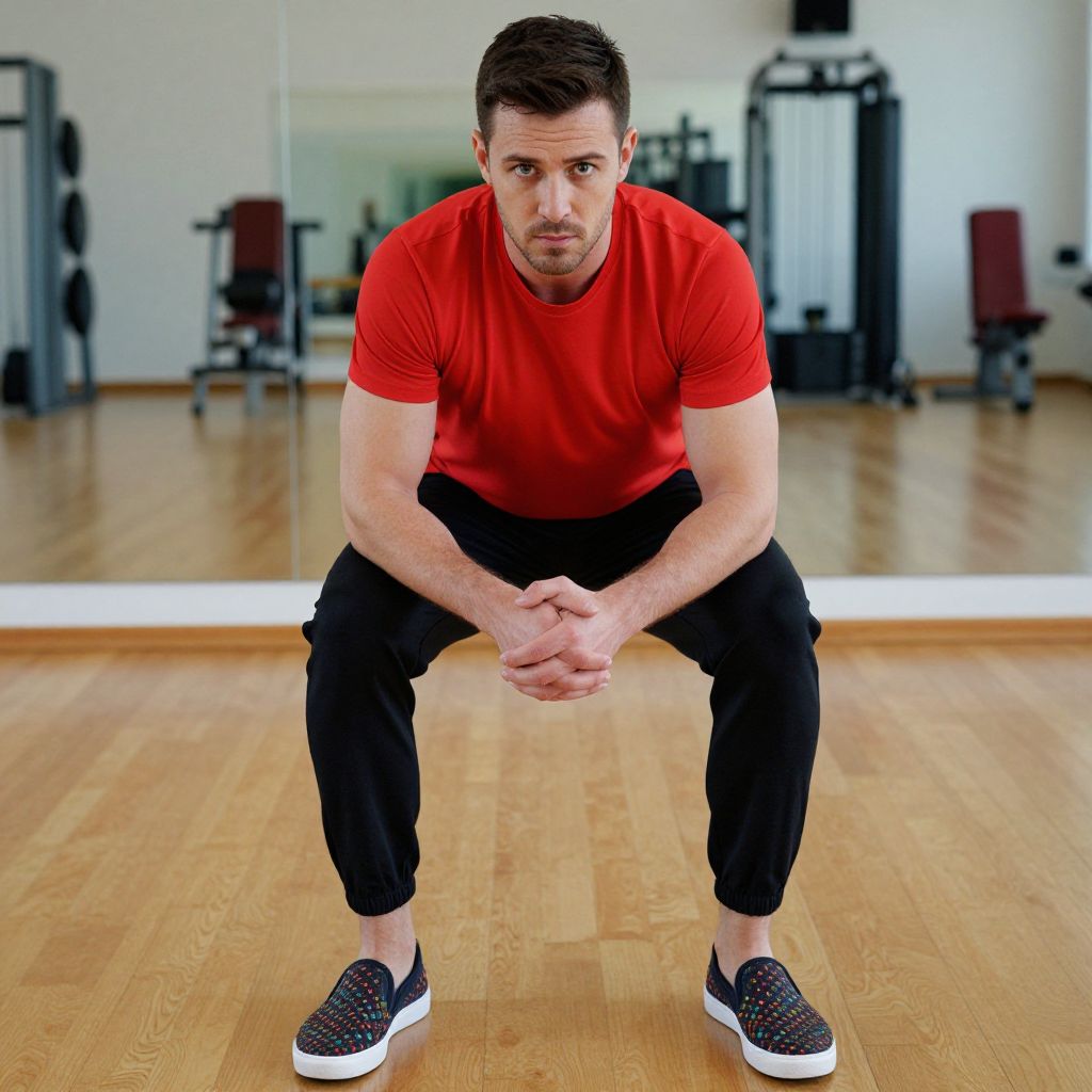 Photograph of a fit, white man with short dark hair and a light beard, squatting in a modern gym. He wears a bright red t-shirt, black capri pants, and black sneakers with white soles. His hands are clasped in front of him. The gym has a wooden floor, white walls, and mirrors reflecting gym equipment in the background. The lighting is bright, highlighting his muscular arms and focused expression. The image has a slight digital enhancement, emphasizing the vibrant colors and clarity.