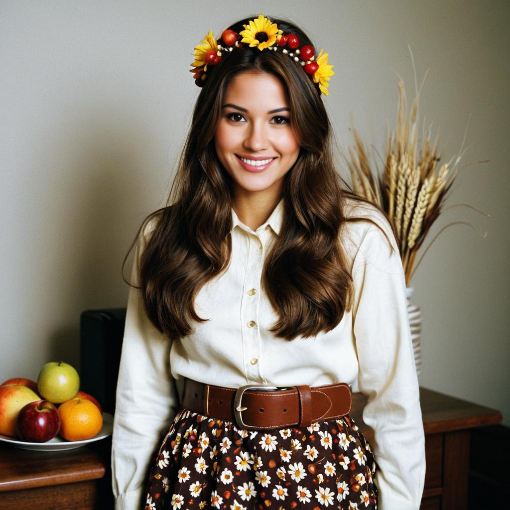 Woman thanksgiving outfit,1girl, solo, realistic, smile, brown hair, shirt, skirt, long hair, looking at viewer, fruit, food, belt, flower, hair ornament, long sleeves, brown eyes, grin