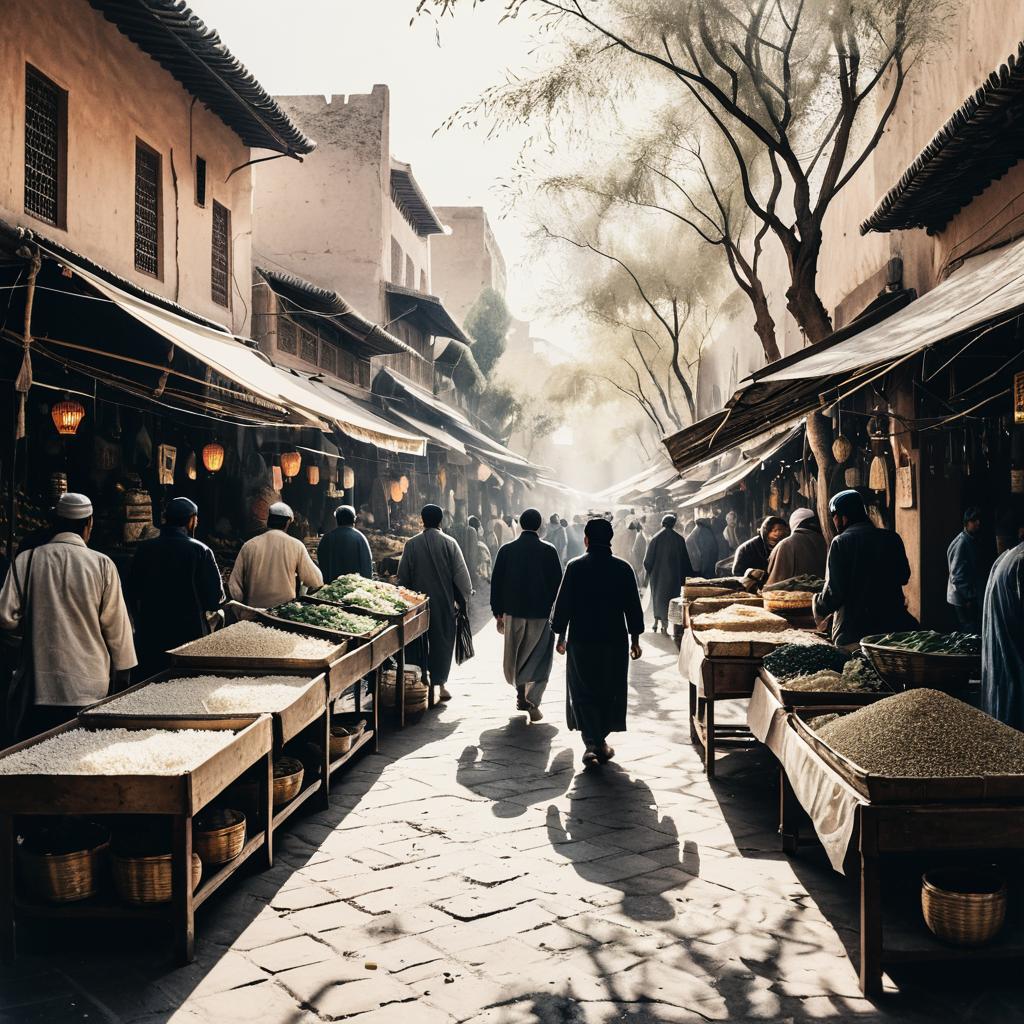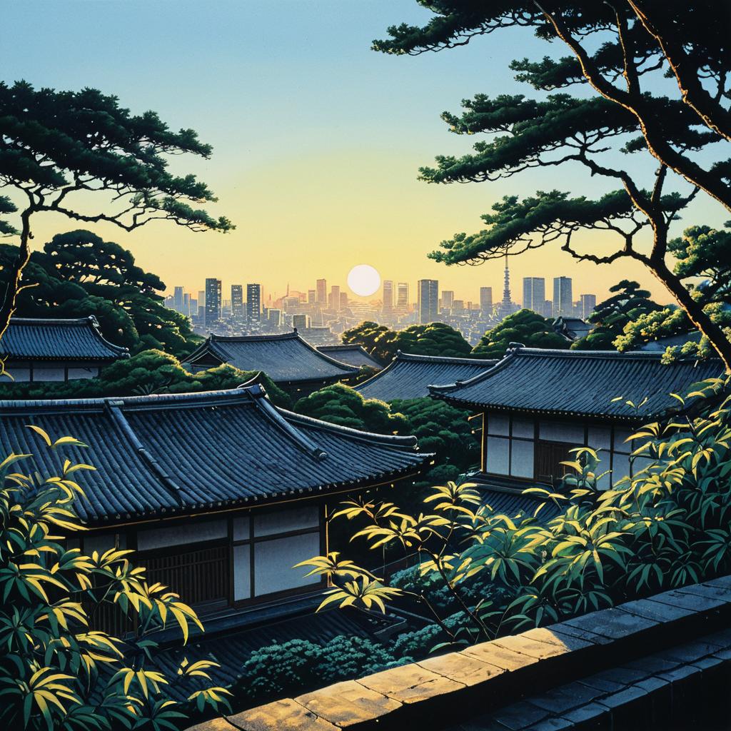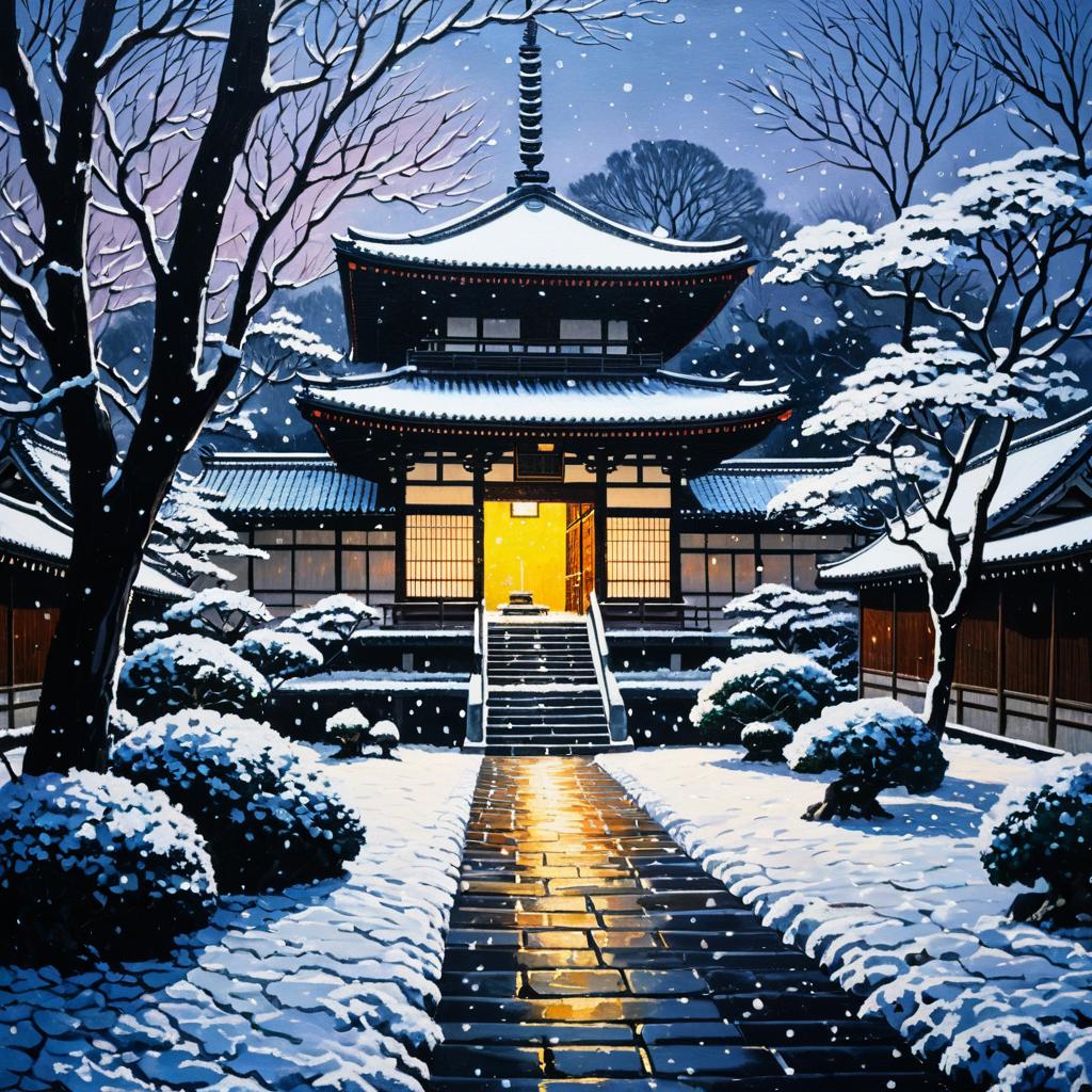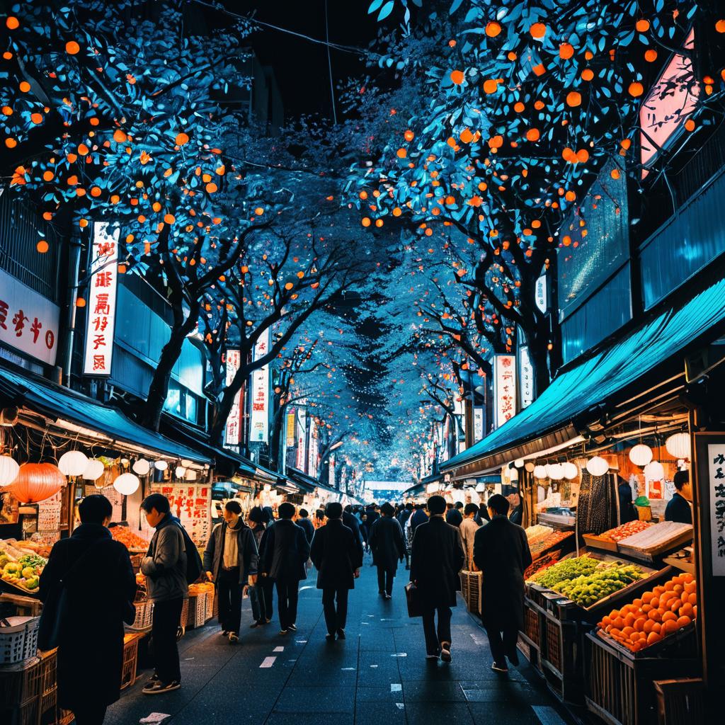 Bold acrylic strokes on rough canvas, portraying a bustling Tokyo street market at night under neon lights, with cinematic backlighting through translucent leaves, referencing Yayoi Kusama, Hokusai