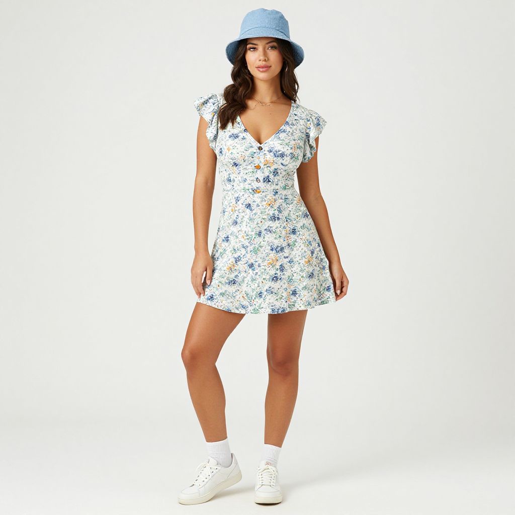 "Woman, contemporary casual, sleeveless romper in a white fabric with a floral pattern in shades of blue and yellow, deep V-neckline, fitted waist, knee-length shorts, white sneakers, minimal jewelry, plain light-colored studio background.. Sexy. Pretty face and beаutiful eyes. Big breasts."