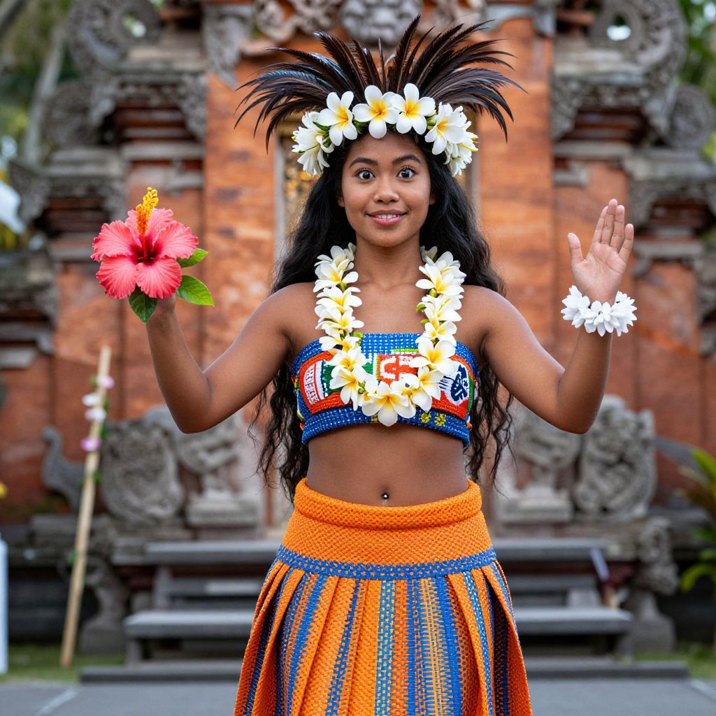 A stunningly dressed Hawaiian dancer with radiant olive-toned skin, wide expressive eyes, and a gentle smile wearing an authentic traditional hula costume, including a vibrant orange and blue woven skirt, a fitted blouse with Hawaiian symbols, and a large feathered crown, standing in a traditional Hawaiian temple garden during a cultural festival with blooming plumeria and native hibiscus flowers.