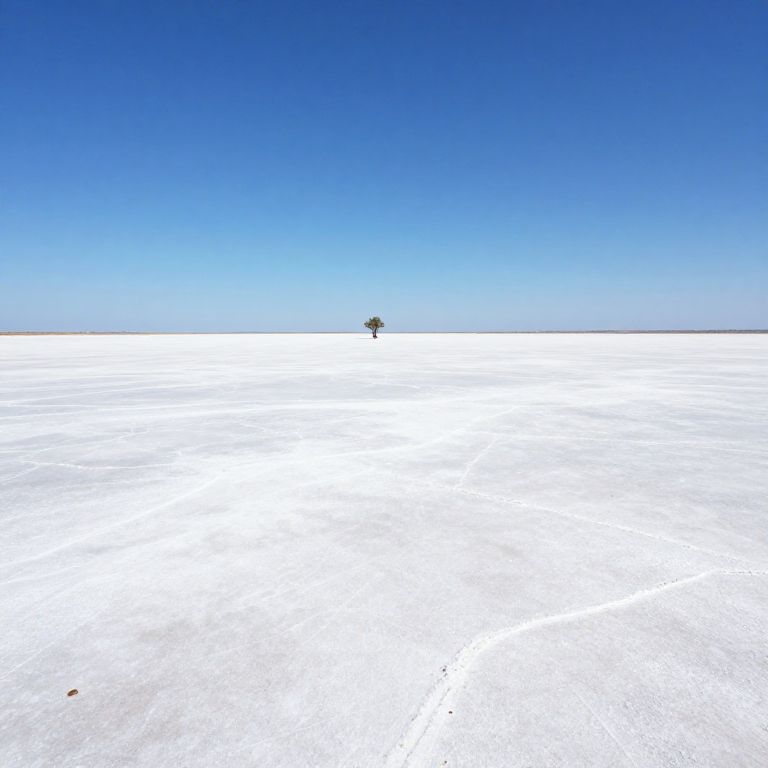 Trend a panoramic photograph, plain salt flat landscape, empty horizon, clear blue sky:: camera is facing North:: a single tree growing on the distant West side of the horizon line,
