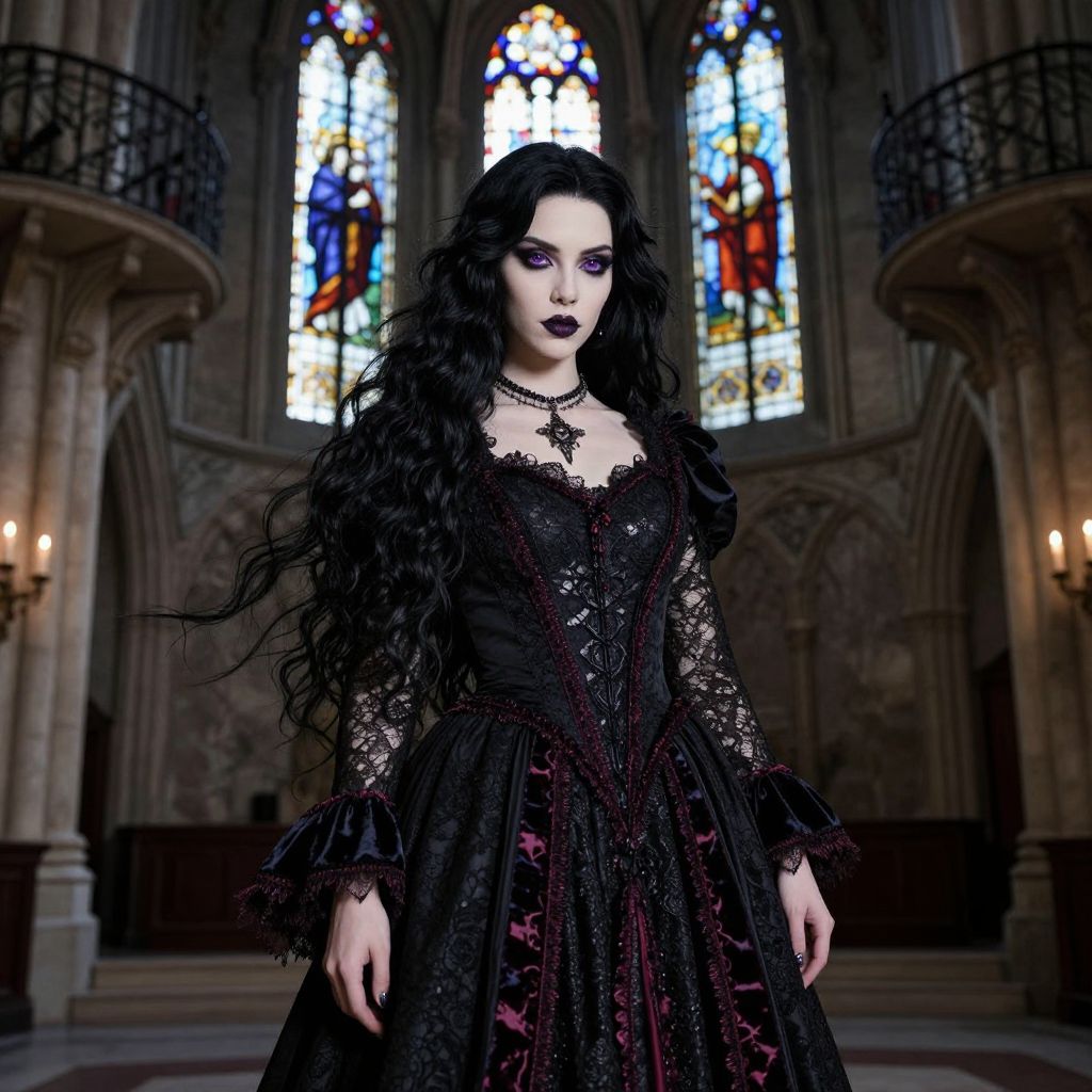 A stunning Gothic queen with long, flowing black hair and cold, piercing violet eyes stands in a dimly lit, cathedral-like hall adorned with stained glass windows and iron balconies, draped in an intricate black lace gown with dark velvet trim and deep crimson accents, exuding an aura of serene mystery and dark elegance.
