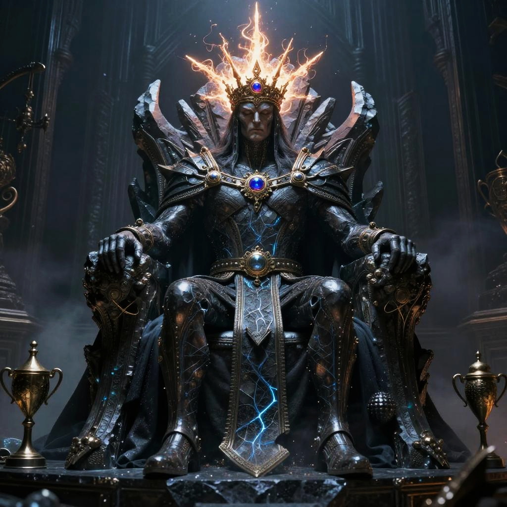40k emperor throne, dark gothic throne room filled with relics and battle trophies, emperor wearing a radiant crown of psychic energy, throne carved from alien stone with luminescent veins, ambient mist and powerful, stoic presence evoking epic narrative