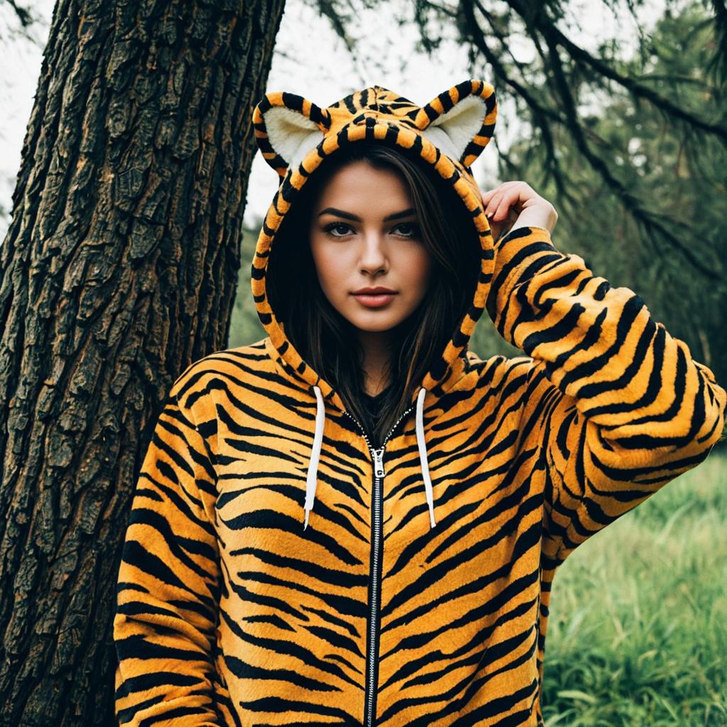 Tiger onesie adults,1girl, solo, tiger print, hood, animal print, realistic, animal costume, tree, animal ears, nature, looking at viewer, lips, hoodie, zipper