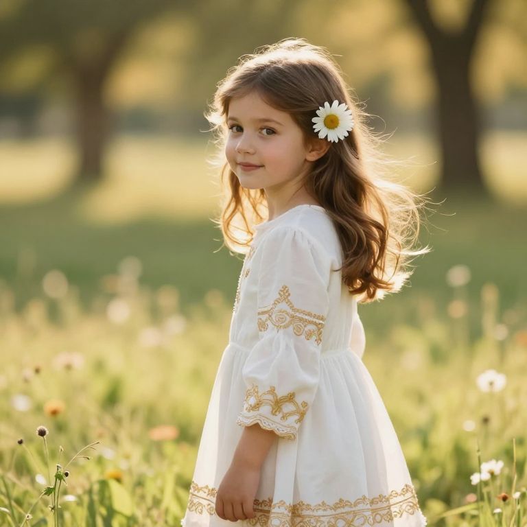 Photograph of a young girl with light brown skin and long, wavy brown hair adorned with a white daisy on her left side. She wears a white, long-sleeved, embroidered dress with gold patterns on the sleeves and hem. She stands in a sunlit meadow, looking over her shoulder with a gentle smile. The background is a blurred, golden-green field with tall grass and scattered wildflowers. Trees with dark trunks are visible in the distance. The sunlight casts a warm, soft glow, enhancing the serene and peaceful atmosphere.