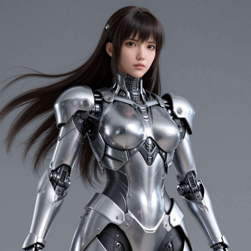 The image depicts a highly detailed, Sorayama-style CG of a woman wearing a futuristic, silver technological armor. The armor is intricately designed with a metallic sheen, featuring various mechanical components and joints. The woman's skin texture is rendered with remarkable realism, showcasing fine details and subtle variations in shading. Her long, flowing hair adds a dynamic element to the composition, contrasting with the rigid, angular lines of the armor. The overall scene is a harmonious blend of organic and mechanical elements, creating a striking visual narrative.