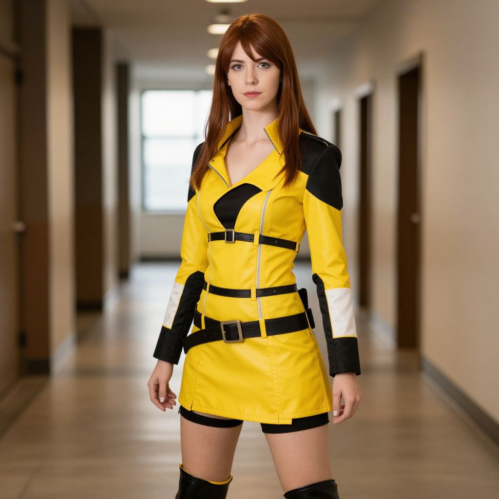 Photograph of a young woman with straight brown hair, wearing a yellow shirt, blue sleeves, and green vest, standing in a blurred urban background.