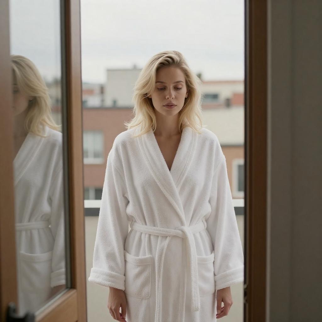 Blonde Woman in Bathrobe at Doorway
