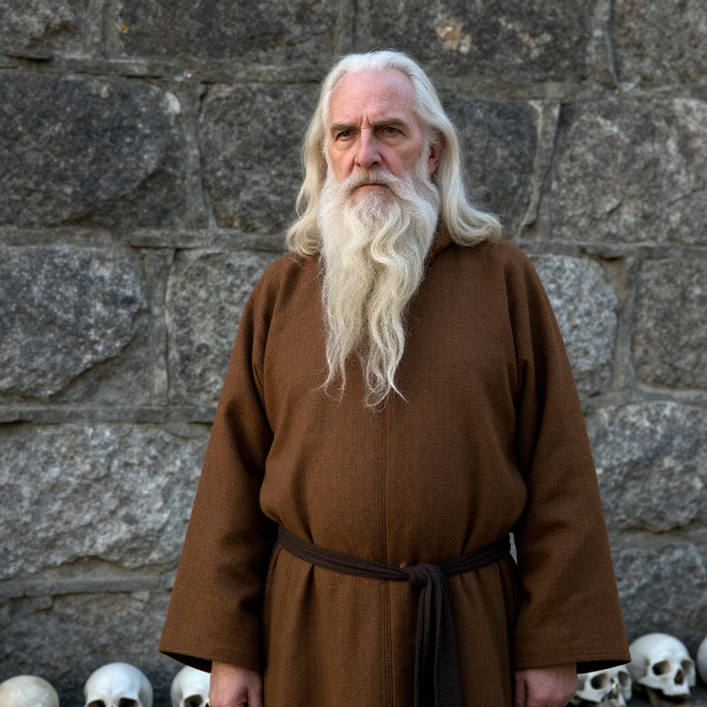 Photograph of an elderly man with long, wavy, white hair and a full, white beard, standing against a gray stone wall. He wears a brown, medieval-style robe with a dark brown belt. His expression is serious. In the bottom left corner, several white skulls are visible. The stone wall has a rough texture, and the lighting highlights the man's facial features and hair. The image has a realistic, high-contrast style, emphasizing the historical, medieval appearance of the subject.