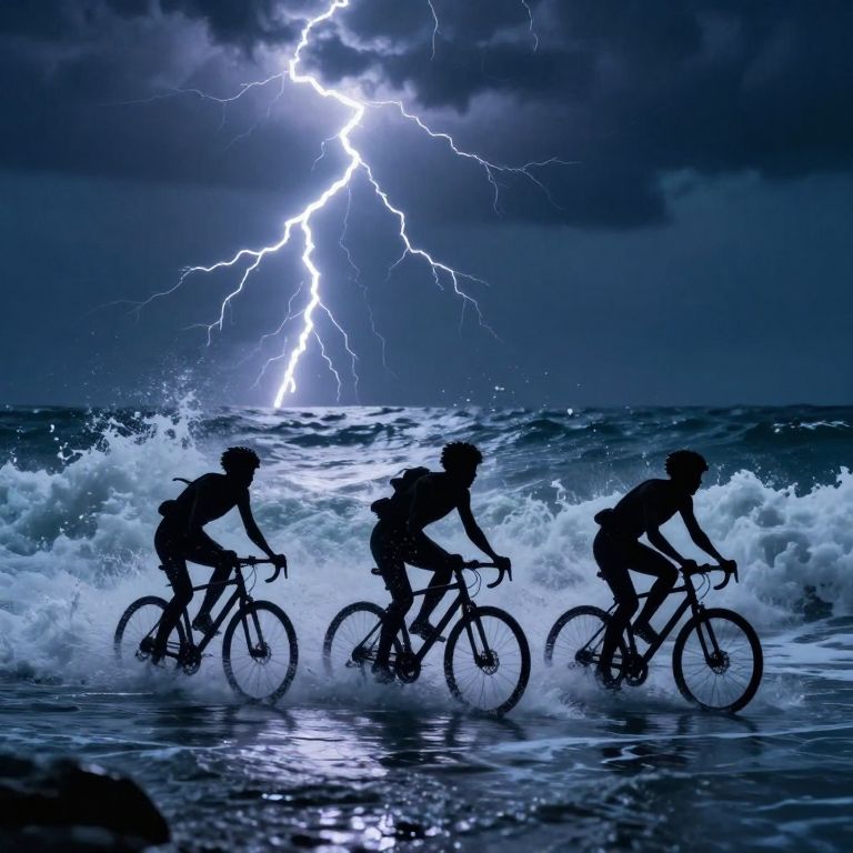 Defying gravity and convention, three silhouetted figures race across a tempestuous sea, their bicycles cutting through waves illuminated by jagged lightning bolts, symbolizing the relentless pursuit of freedom amidst chaos and the electrifying thrill of embracing the unknown.