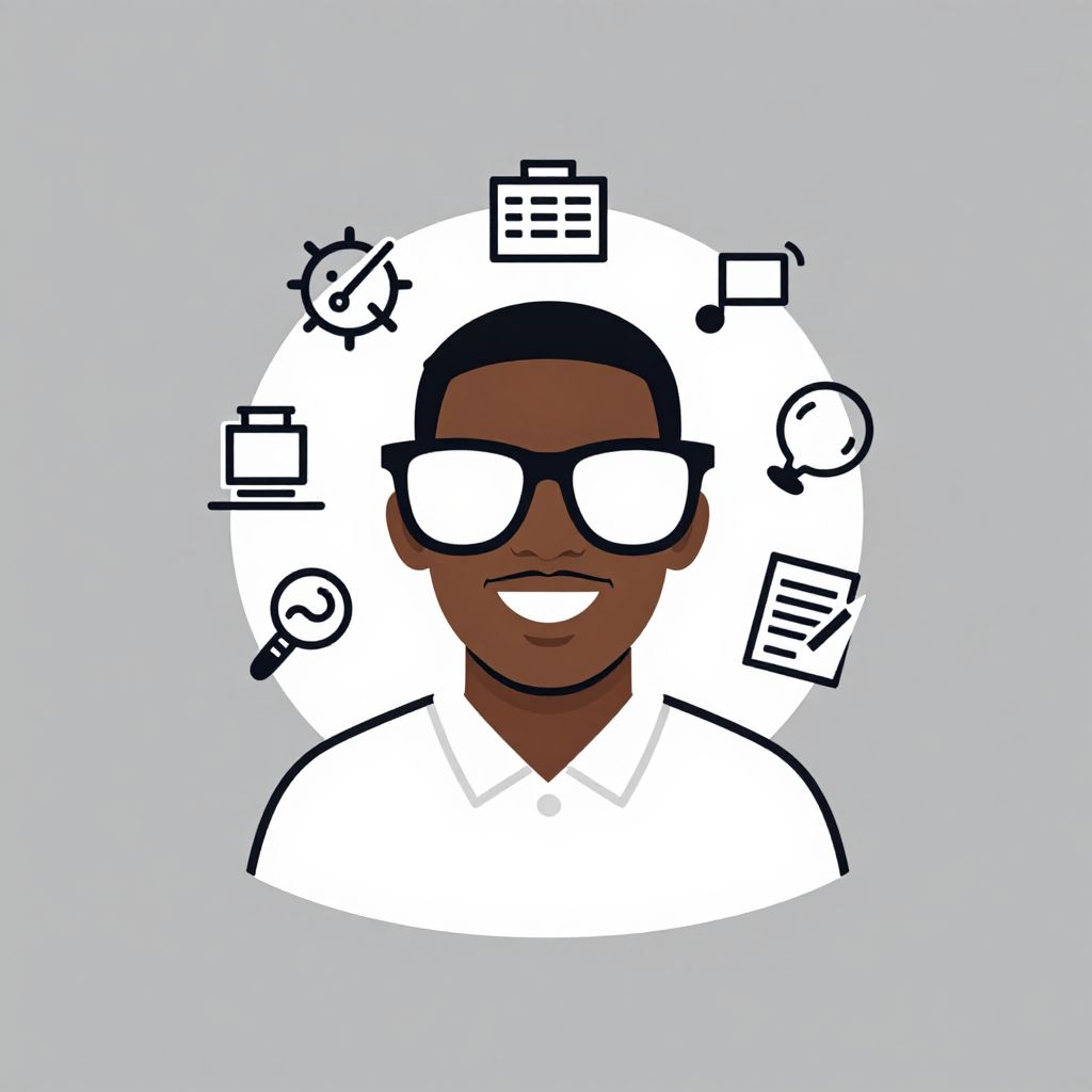 Slick simplistic and modern logo of an african man with huge glasses. information technology symbols are around his head. he is happy to be learning and building his craft,