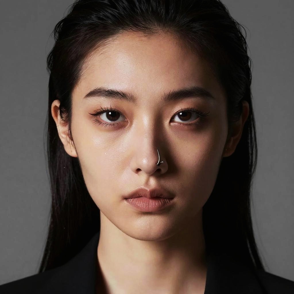 Woman with hooked nose, editorial fashion shoot, high contrast lighting, avant-garde makeup, studio background