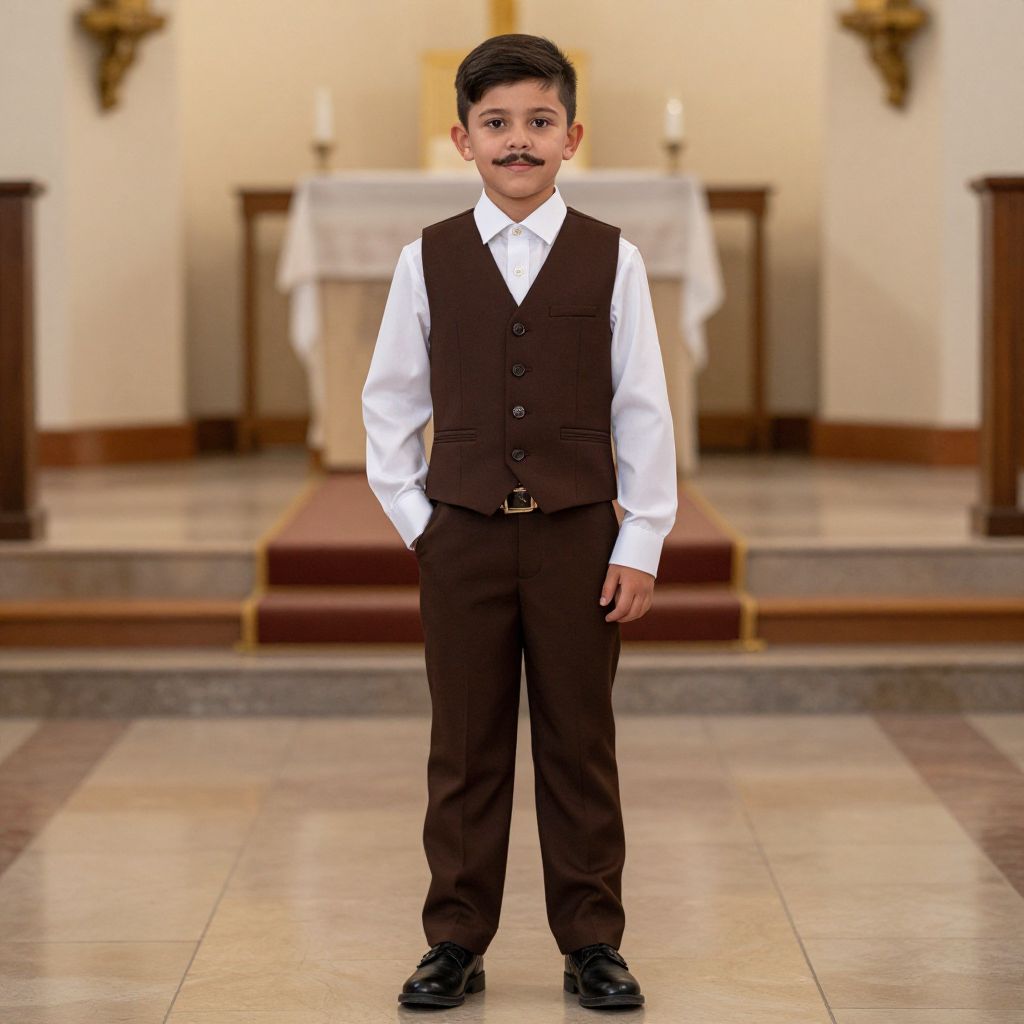 Christening costume, 1boy, male focus, solo, facial hair, shoes, pants, full body, church, shirt, standing, indoors, vest, looking at viewer, realistic, brown pants, white shirt, mustache, long sleeves, brown vest, hand in pocket, belt