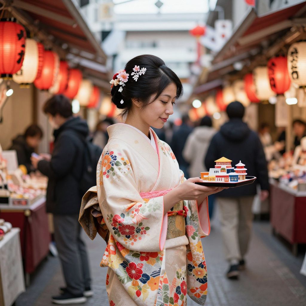 In this captivating image, a woman dressed in traditional Japanese attire, specifically a kimono adorned with intricate floral patterns, stands gracefully in a bustling market setting. Her hair is elegantly styled with a decorative headpiece featuring delicate flowers and leaves, adding a touch of elegance to her appearance. She holds a tray of small, intricately crafted objects, possibly miniature buildings or sculptures, which she appears to be arranging or examining with great care. The background is filled with vibrant red lanterns hanging from the ceiling, casting a warm glow that enhances the festive atmosphere. The market is alive with activity, with blurred figures of people moving about, creating a sense of depth and movement. The overall composition is balanced, with the woman as the central figure, surrounded by the lively market scene that extends into the distance, creating a harmonious blend of tradition and modernity.
