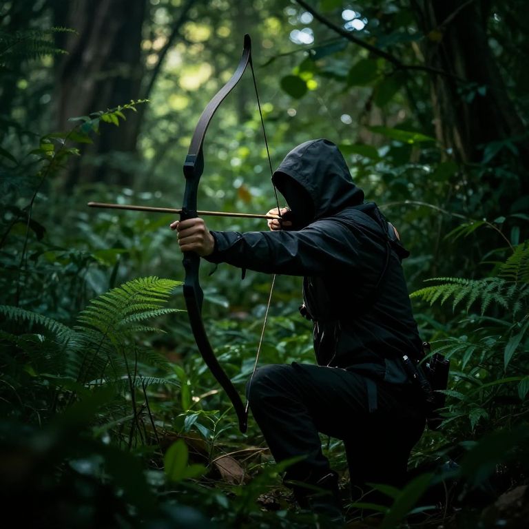 Photograph of a hooded archer in dark clothing crouching in a dense, green forest, aiming a black bow with focus.