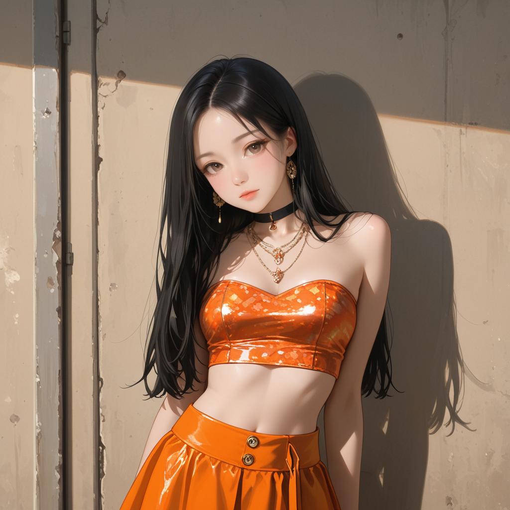 1girl, skirt, realistic, black hair, jewelry, orange skirt, long hair, solo, necklace, k-pop, strapless, bare shoulders, shadow, crop top, tube top, lips, standing, midriff, looking at viewer, asian, black eyes, cowboy shot, miniskirt, choker, brown eyes