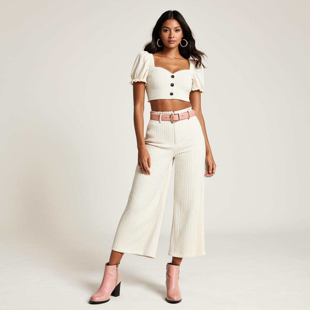 Woman, contemporary casual, ribbed crop top in ivory with decorative buttons, sweetheart neckline, short ruffled sleeves, high-waisted wide-leg pants in pastel pink, belt loops with a matching fabric belt, cropped length, beige ankle boots with black heel, plain white studio background