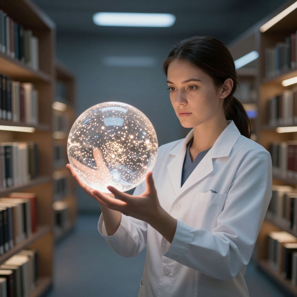 Woman in a lab coat holding a glowing, translucent sphere filled with sparkling particles, surrounded by shelves of illuminated books in a futuristic library setting.