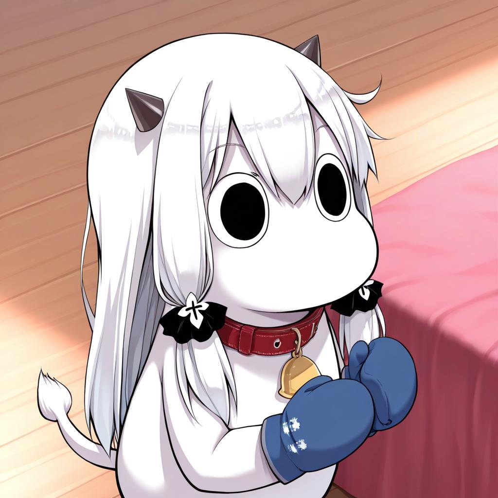 Muppo, kantai collection, 1girl, horns, tail, hair between eyes, solid circle pupils, long hair, sidelocks, collar, mittens, by artist kiira, illustrious