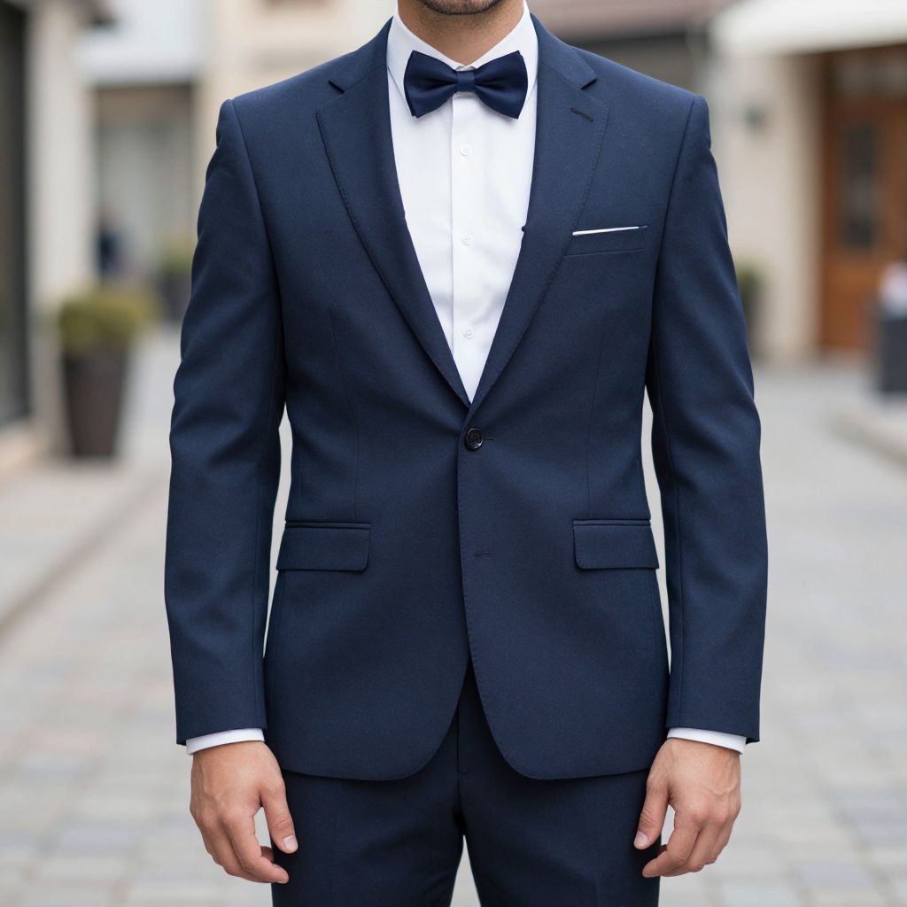 Photograph of a man from the neck to the waist, wearing a dark navy blue, single-breasted suit with a white dress shirt and a black bow tie. The suit jacket has a single breast pocket with a white pocket square. The background is slightly blurred, showing a cobblestone street with potted plants and storefronts. The man's hands rest at his sides, and the lighting is natural, highlighting the clean lines and smooth texture of the suit fabric. The image focuses on the formal, elegant attire against an urban street setting.