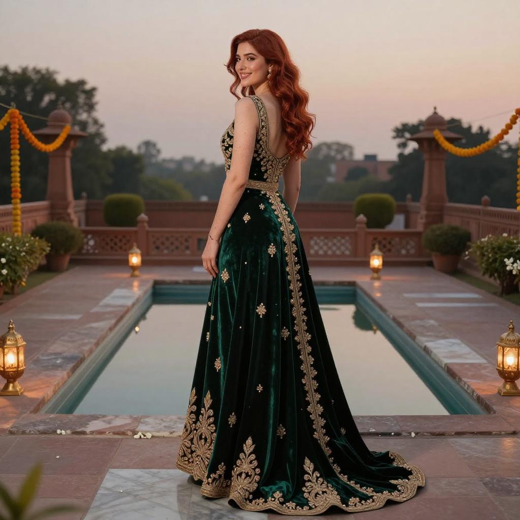 Masterpiece, best quality, (photorealistic:1.4), full body, ultra-detailed photo of a slender auburn-haired woman with loose waves, sun-kissed freckles, a small delicate wrist tattoo, smiling with an hourglass silhouette, viewed completely from behind, wearing elegant emerald green velvet gown with intricate gold embroidery, fitted bodice, flowing layered skirt with a subtle train, and a delicate gold belt, standing in a terraced Mughal rooftop garden at dusk with reflecting marble pools, carved sandstone balustrades, jasmine-scented air and strings of marigold garlands and lanterns casting warm light at dusk, smiling with an hourglass silhouette, viewed completely from behind