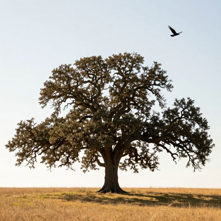 Majestic oak stands alone against a pale sky, its gnarled branches reaching outward like skeletal arms, while a solitary bird soars above, casting a shadow over the golden grass below.