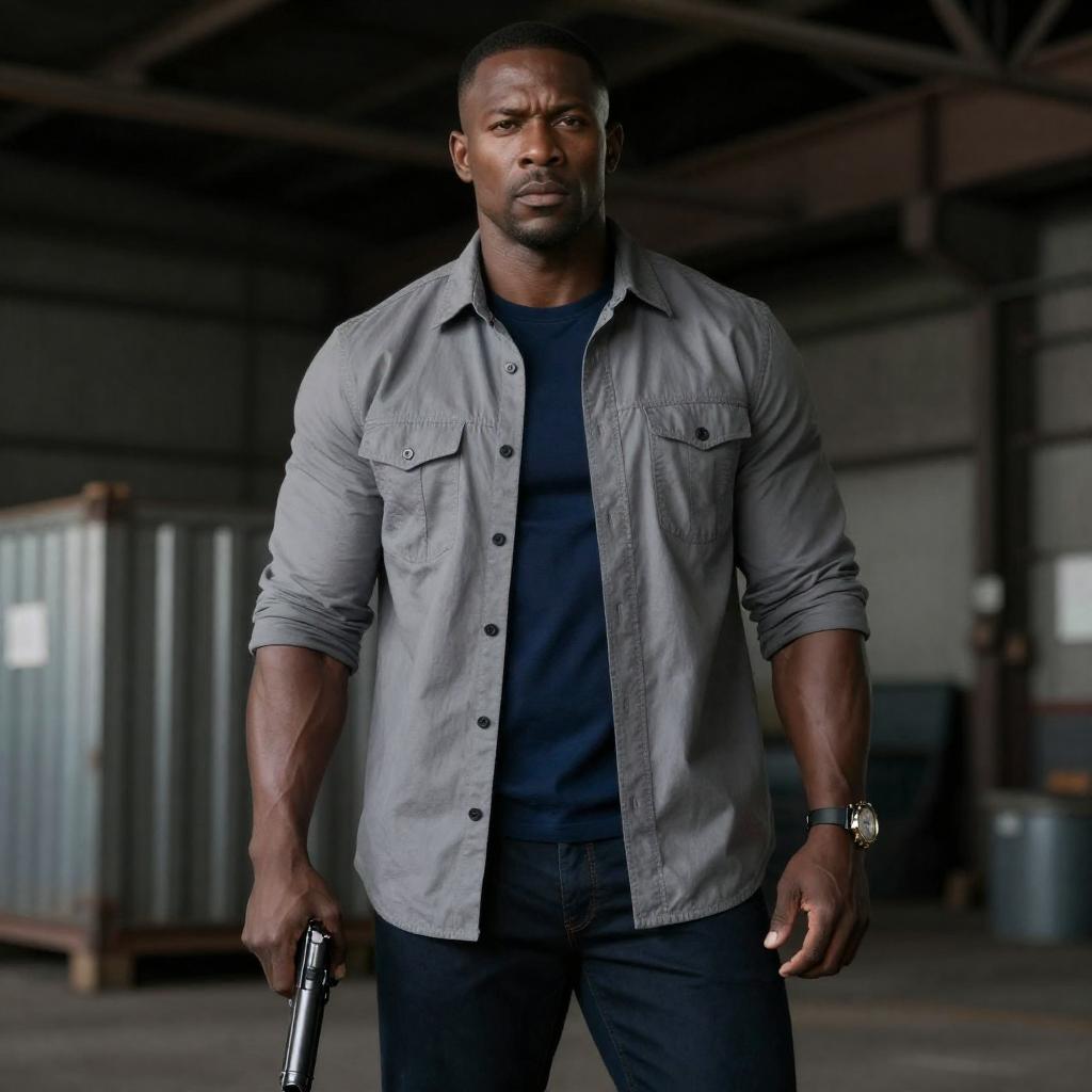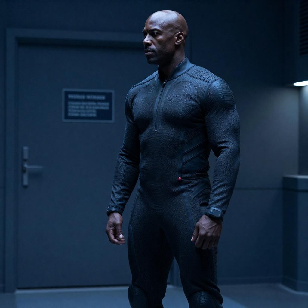 Photograph of a bald, muscular Black man in black tactical armor with red accents, smiling fiercely while firing two futuristic guns with red laser sights. He stands in a dimly lit, industrial setting with a metal wall and yellow-striped panel in the background. His right arm is extended forward, aiming one gun, while his left arm holds the other.