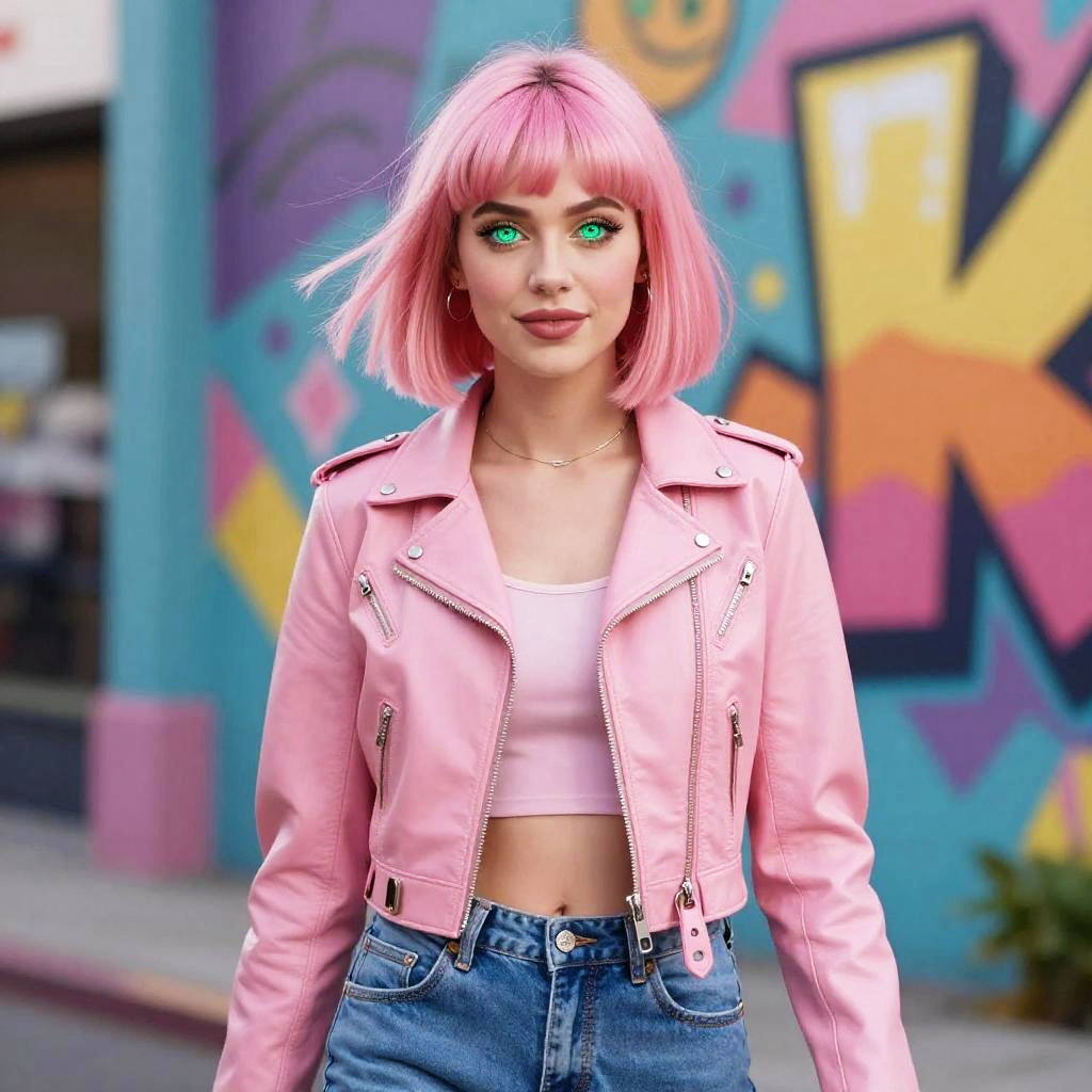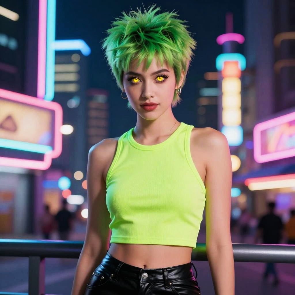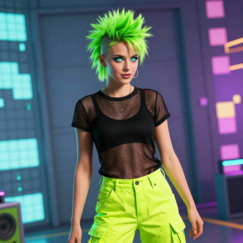 (Patrick Nagel style photo) 2000s neon-green-haired woman with spiky mohawk, sparkling bright teal eyes. Dressed in a black mesh shirt and neon cargo pants, with a slender figure. Set against a digital pixelated backdrop with bright lighting, creating a cheerful ambiance. Rendered in ultra-realistic, high detail and quality with vibrant colors in an 8K resolution, capturing a dynamic composition with a nostalgic vibe. The scene exudes a playful, lively atmosphere.