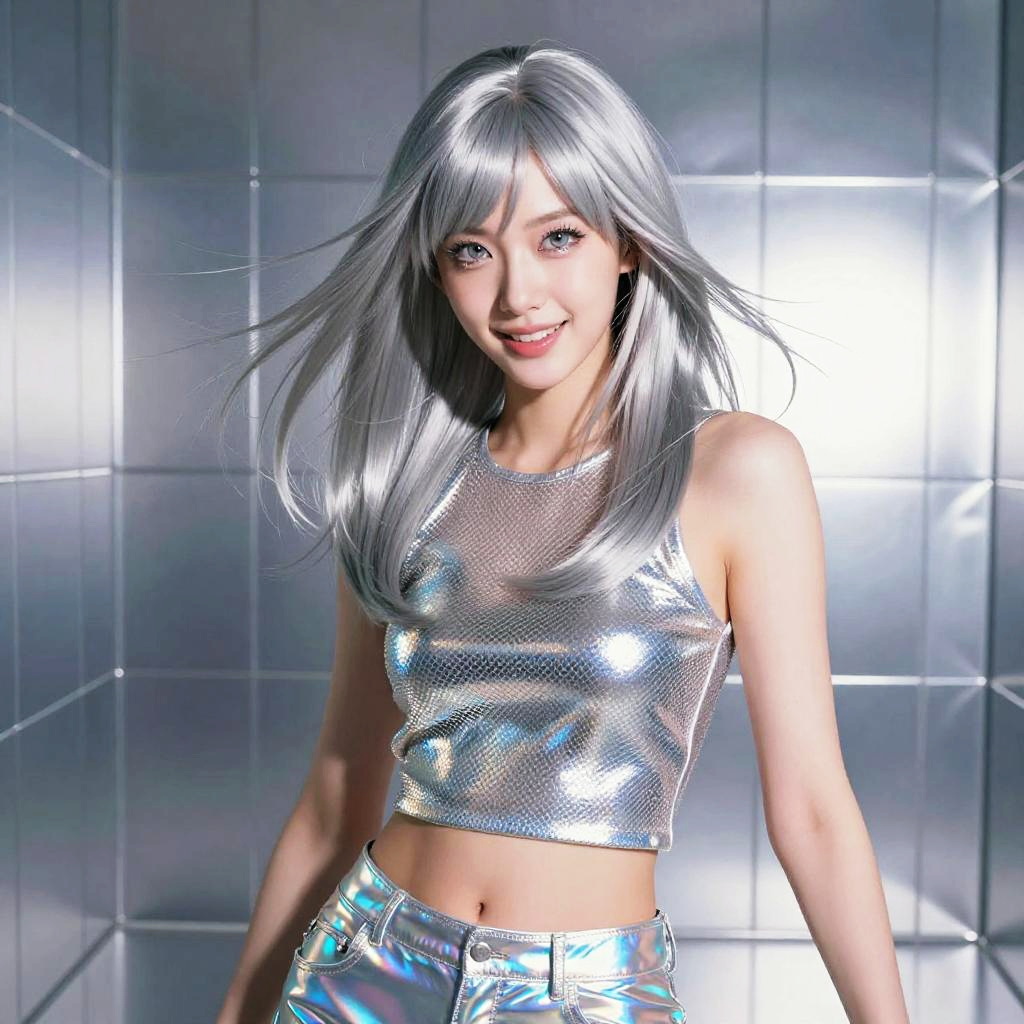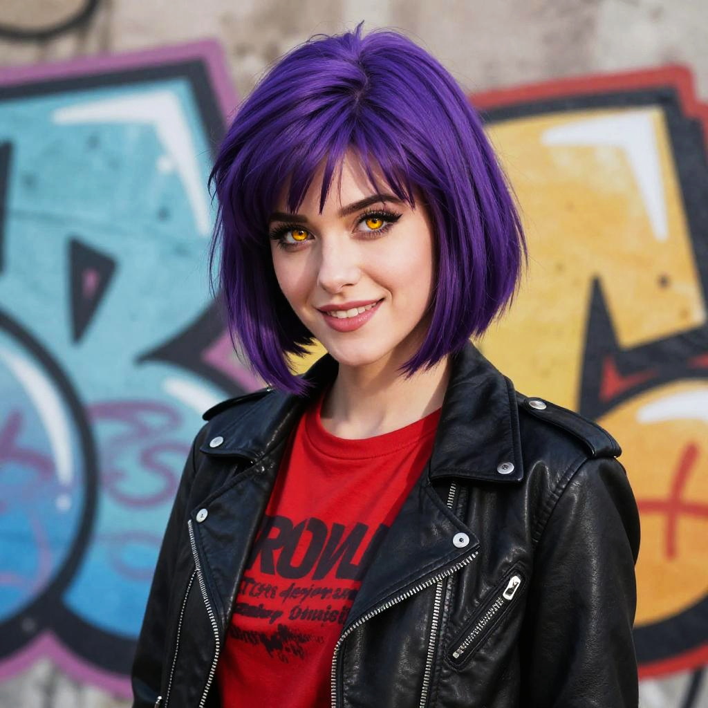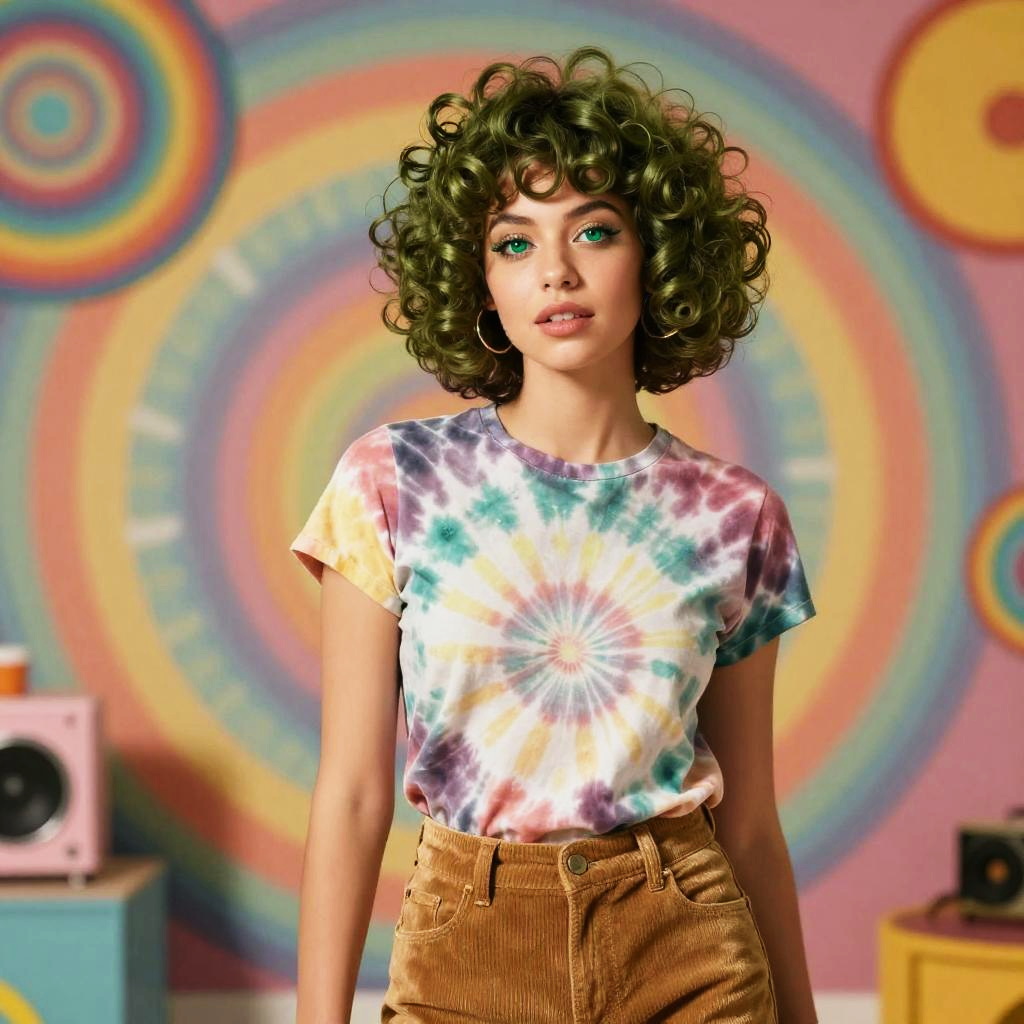 (Patrick Nagel style photo) 2000s neon-green-haired woman with spiky mohawk, sparkling bright teal eyes. Dressed in a black mesh shirt and neon cargo pants, with a slender figure. Set against a digital pixelated backdrop with bright lighting, creating a cheerful ambiance. Rendered in ultra-realistic, high detail and quality with vibrant colors in an 8K resolution, capturing a dynamic composition with a nostalgic vibe. The scene exudes a playful, lively atmosphere.