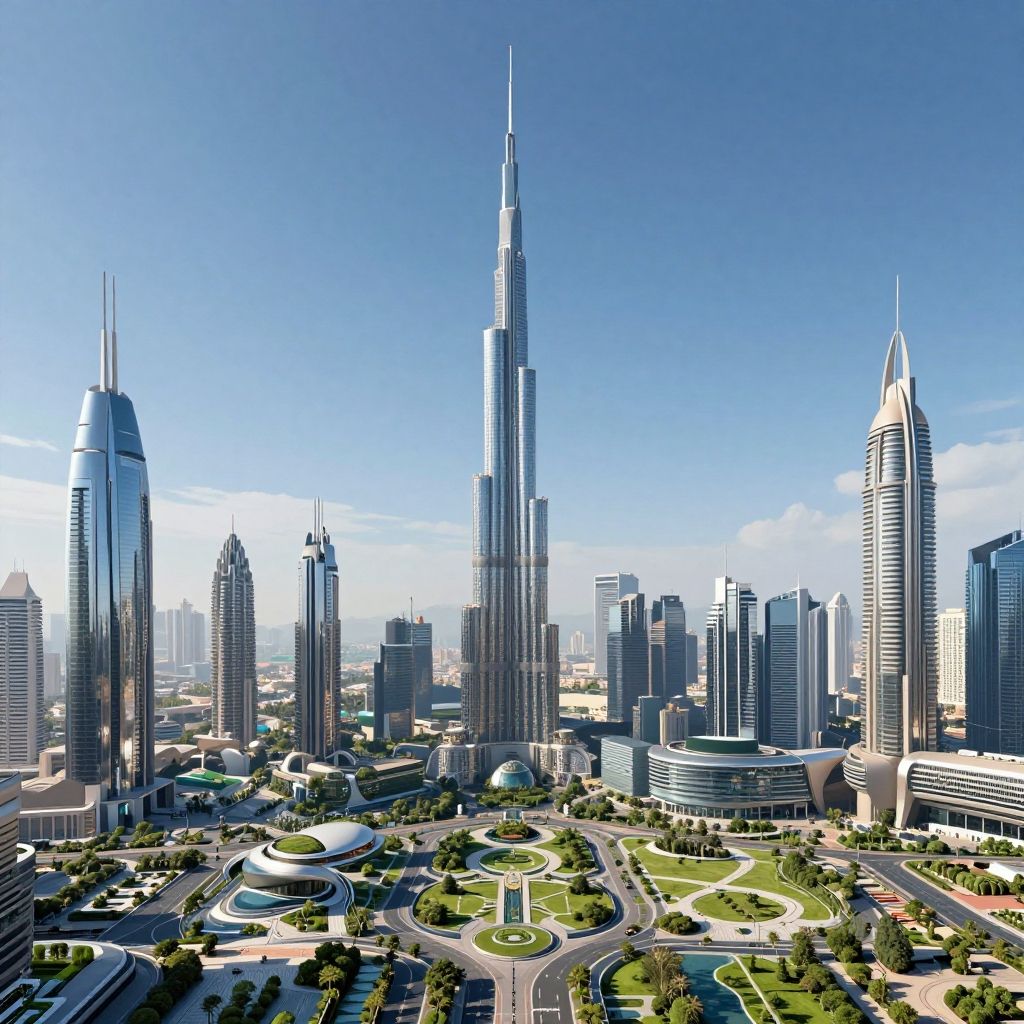 Photorealistic CGI of a modern, futuristic cityscape with towering skyscrapers, clear blue sky, lush green parks, and busy streets.