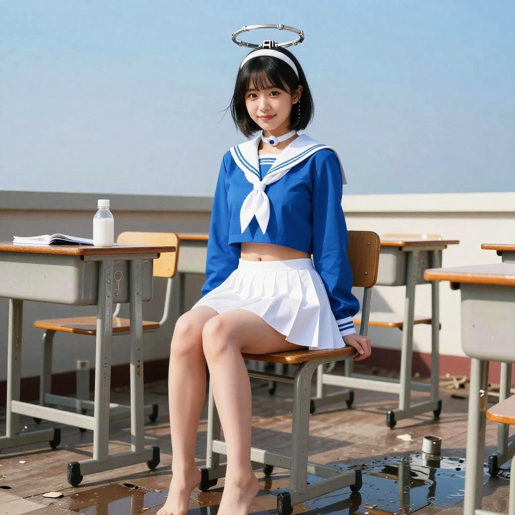 Best quality, ultra high res, (photorealistic:1.4), 1girl, cute, (Kpop idol), (aegyo sal:1), ((puffy eyes)), looking at viewer, full body, facing front, smiling, arona, mechanical halo, (solo), (short hair), (single Left side braid), ((school uniform)), ((barefoot)), ((blue shirt)), ( long sleeves), ((white bowtie)), ( (white choker)), ( (white hairband)), ((white sailor collar)), (( white skirt)), ((midriff)), (ruined classroom), (classroom desk), writing desk, blue sky, puddle, reflective water, (Sleeve colour blue), sit on a desk, wooden floor, (bare navel)