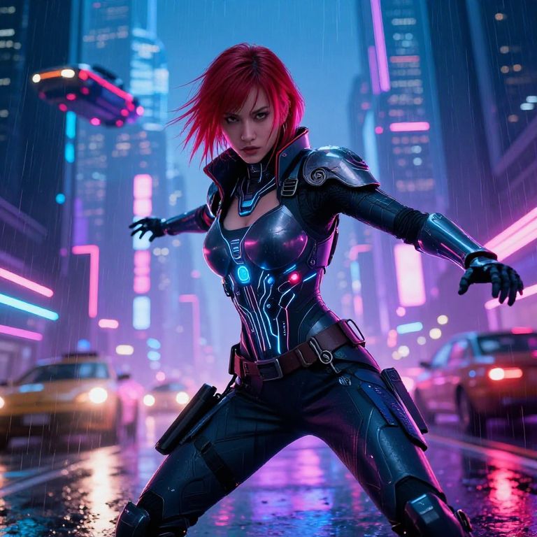 Naxida as a futuristic warrior in sleek armor, standing on a neon-lit cyberpunk city rooftop, rain pouring down, dramatic lighting, high-tech gadgets and holograms, dynamic and intense atmosphere, digital art
