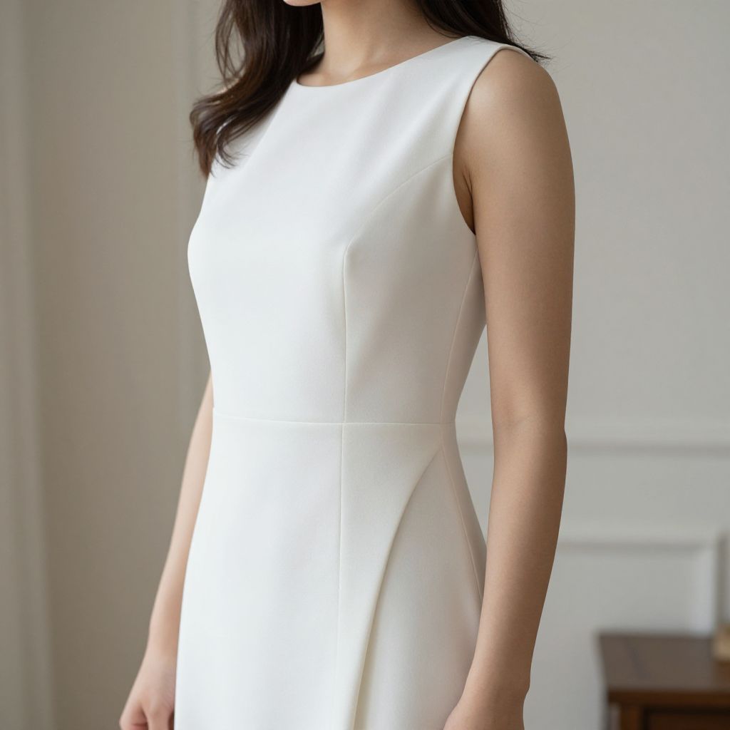 Photograph of a woman from the chest down, wearing a sleeveless, form-fitting white dress with subtle vertical seams. Her dark brown, wavy hair falls over her shoulders. The background is softly blurred, featuring a plain white wall with a wooden piece of furniture partially visible on the right. The dress has a smooth, satin-like texture, emphasizing the woman's slender, graceful physique. The lighting is natural, highlighting the dress's clean, elegant lines. The image focuses on the dress's simplicity and style.