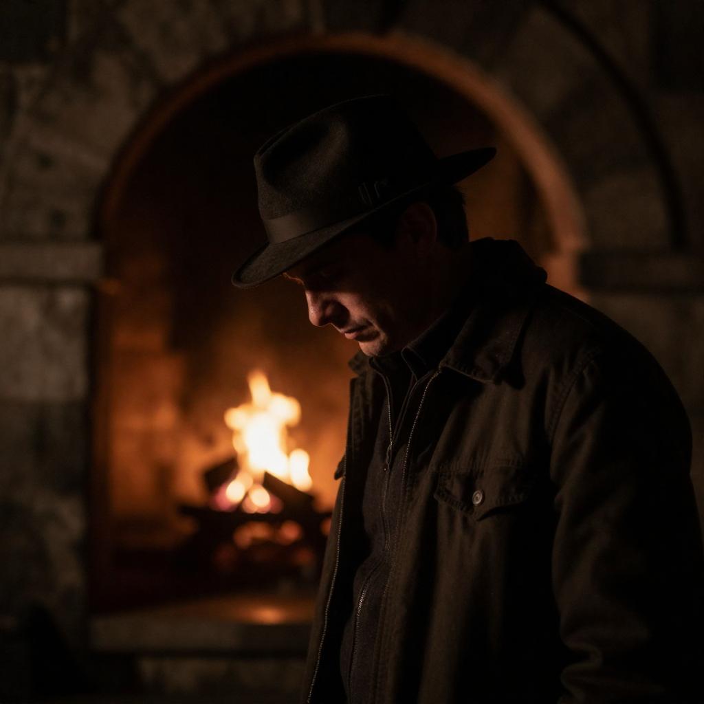 Photograph of a dimly lit, ornate room with rich, patterned carpet. A man in a dark coat stands to the right, bending over a glowing object on the floor. Another glowing object is on a nearby chair. The background features wooden furniture, lamps, and framed pictures. The man's face is partially shadowed, creating a mysterious atmosphere.