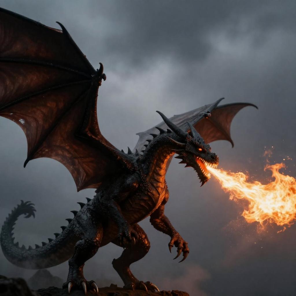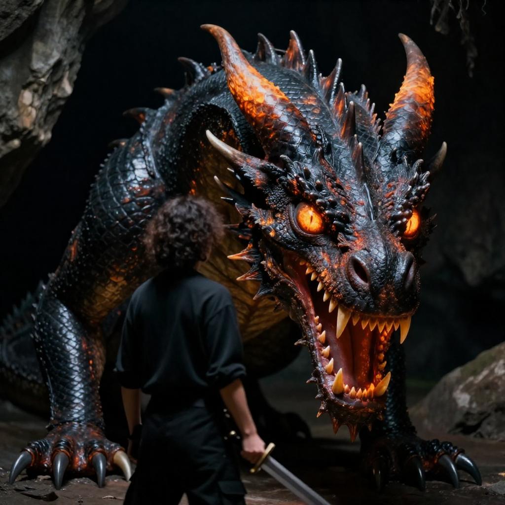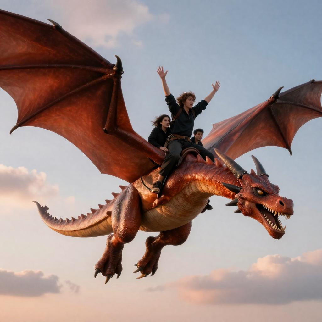 CGI dragon with large wings, orange and brown fur, and sharp teeth flying through a cloudy sky at sunset. Person riding dragon, arms raised, wearing dark clothing. Two people, intense expressions. Background: pink and blue sky.