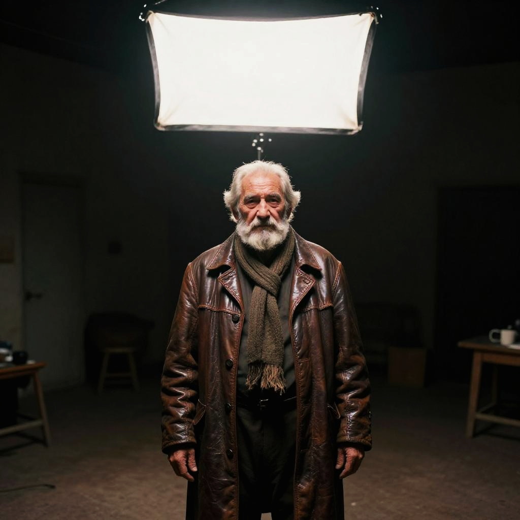 Portrait of an elderly man with a silver beard and broad-shouldered sturdy build, wearing a weathered brown leather duster and wool scarf, standing alone in a dark open room. Soft, volumetric chiaroscuro lighting from a large softbox directly above highlights the subject's reflective expression and detailed texture of the clothing. The image has a cinematic analog film quality with sharp details and subtle grain.