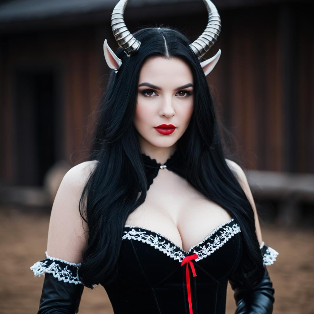 Enchantress villain costume,1girl, solo, green skin, colored skin, horns, long hair, breasts, jewelry, blurry background, looking at viewer, black hair, necklace, blurry, collarbone, dress, facial mark