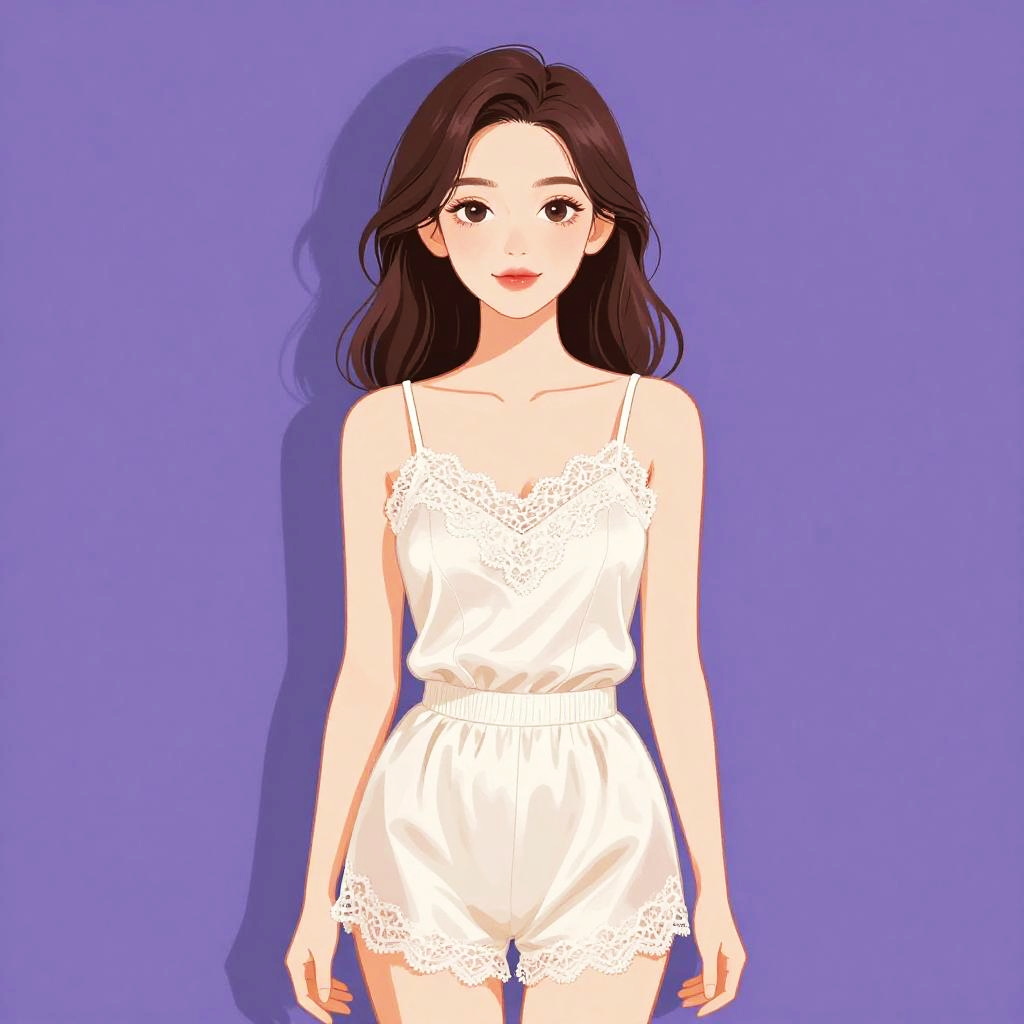 Woman with pretty face and pretty hair. Vintage-inspired ivory silk camisole, vintage lace overlay, soft cream color, wide lace straps, matching ivory silk shorts, delicate pintuck detailing, breathable fabric, timeless elegance, feminine silhouette, ideal for cozy nights. --sref 1461