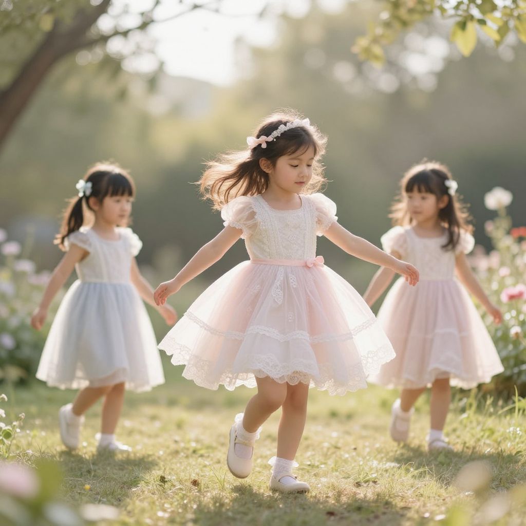 An ethereal symphony of pastel hues and delicate lace whispers of childhood wonder, where imagination takes flight and every step is a dance with the ephemeral magic of a garden party under the sun.