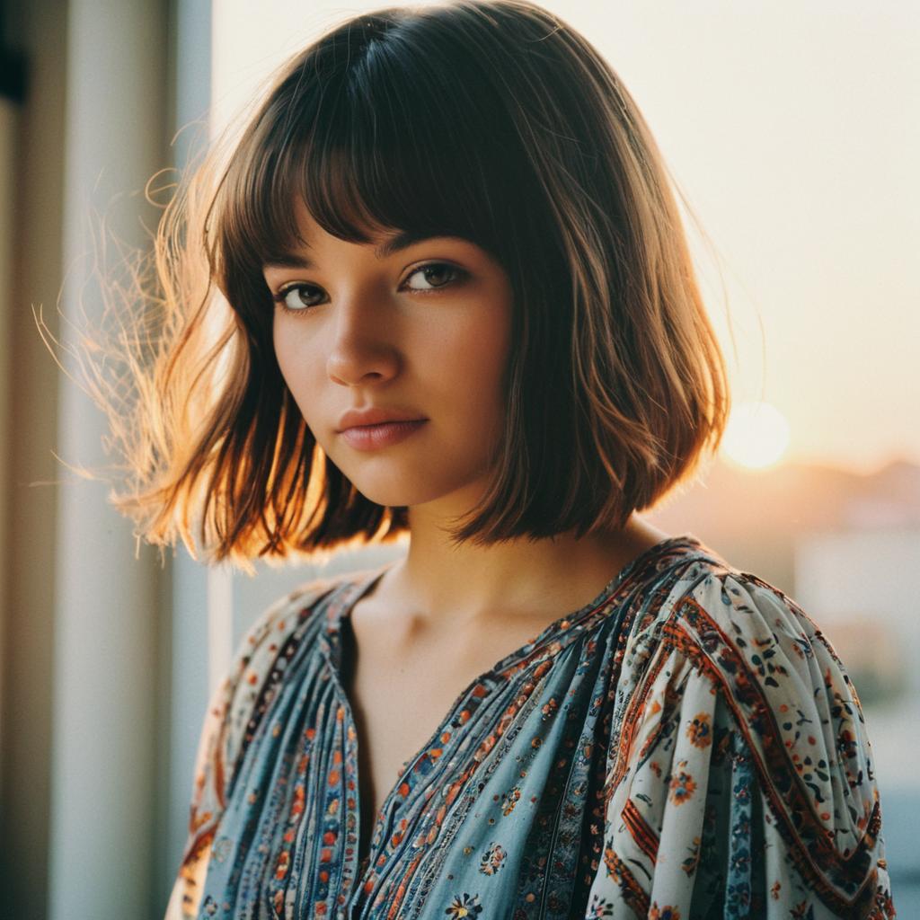 Shoulder-Length Straight hairstyle on young woman, wearing bohemian dress, in botanical garden, captured in fashion editorial style with golden hour sunlight.